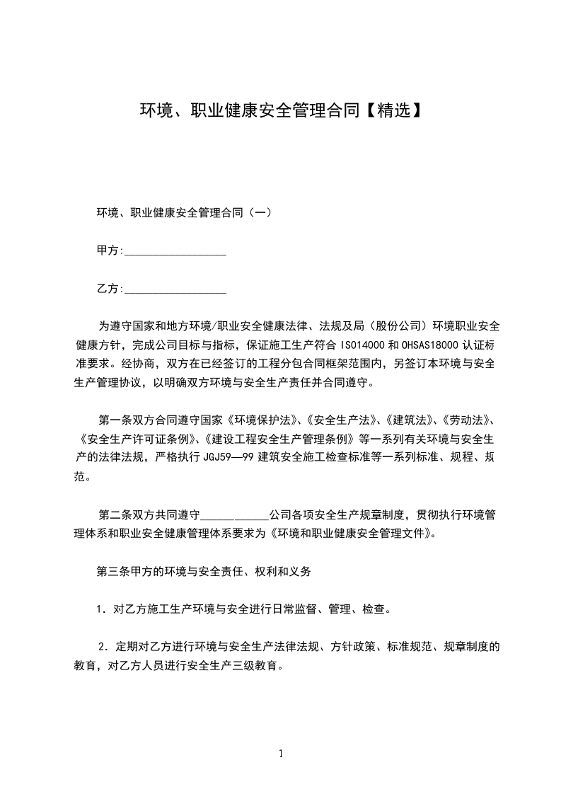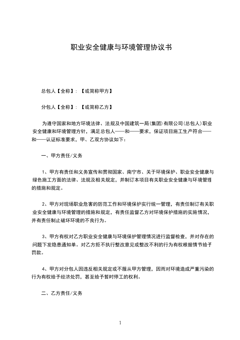 为遵守国家和地方环境法律、法规及中国建筑一局(集团)有限公司(总包人)职业安全健康和环境管理方针,满足总包人——和——要求,保证项目施工生产符合——和——认证标准要求,甲、乙双方协议如下: