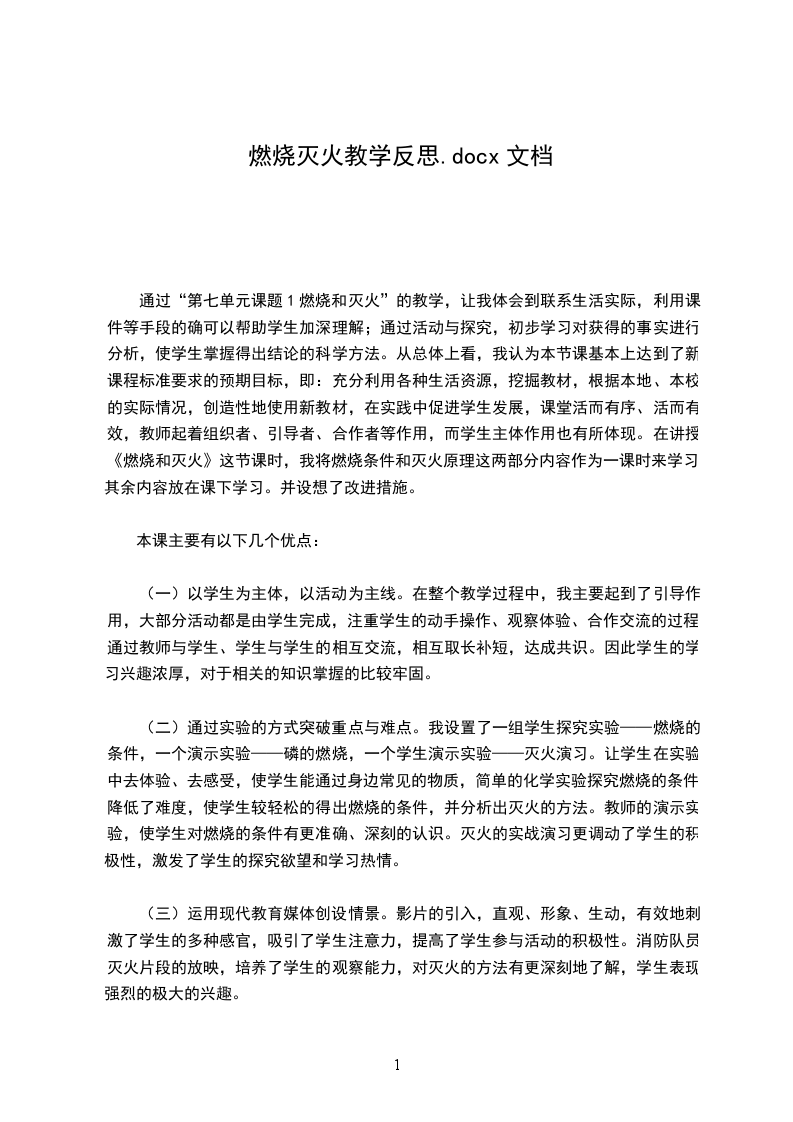 不足:一是课堂上教师的语言有的时候不够简洁,提出的系列问题有的还有待进一步着商,使问题点拨恰到好处;二是学生的参与度尽管较以前的课堂有所提到,但力度还不够,要想方设法地调动学生参与意识,增强自主性。三、对学生的第一个实验即猜想影响燃烧的要素时,实验是我都给设计好的了,学生只需做实验即可轻易得出,限制了他们的思维的发展,课后我想完全可以只提供药品和仪器,让学生小组去设计实验,得出相应的结论,这样做的具体好处我认为是:让学生从从燃烧现象探究燃烧需要什么条件,使新知识建立在对生活的直观感受上,激发学生学习兴趣,产生求知欲,对提出的问题作出合理的猜想。四、针对以上出现的问题,如果重上这节课,我会一开始就把学生学习的主动权交给学生,我认为我再课堂教学中没有更合理适度的掌握好放与收,也就是说驾驭课堂能力还要进一步增强。