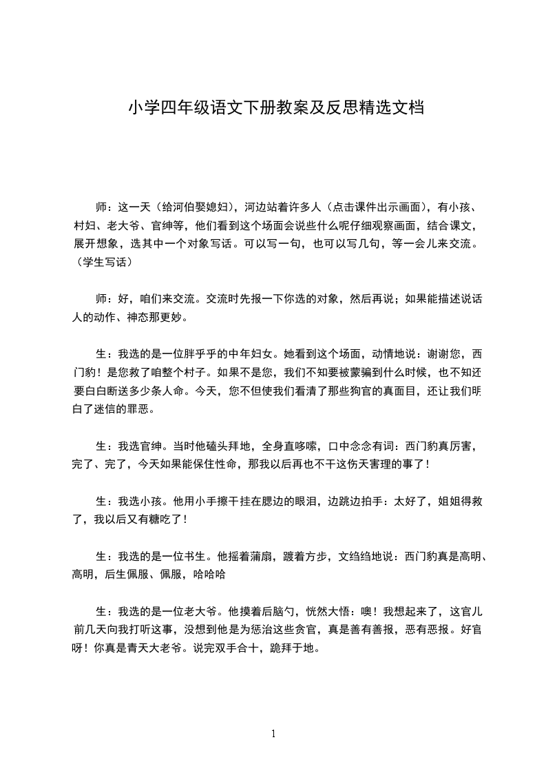 生:我选的是一位胖乎乎的中年妇女。她看到这个场面,动情地说:谢谢您,西门豹!是您救了咱整个村子。如果不是您,我们不知要被蒙骗到什么时候,也不知还要白白断送多少条人命。今天,您不但使我们看清了那些狗官的真面目,还让我们明白了迷信的罪恶。