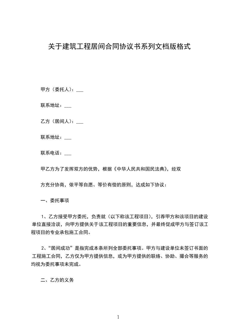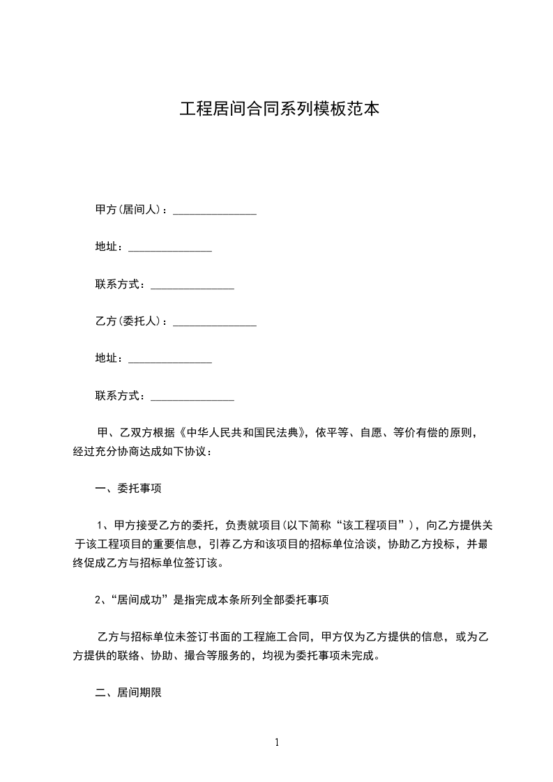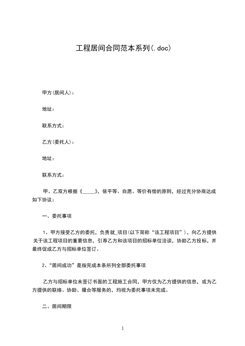 1、甲方接受乙方的委托,负责就_项目(以下简称“该工程项目”),向乙方提供关于该工程项目的重要信息,引荐乙方和该项目的招标单位洽谈,协助乙方投标,并最终促成乙方与招标单位签订。