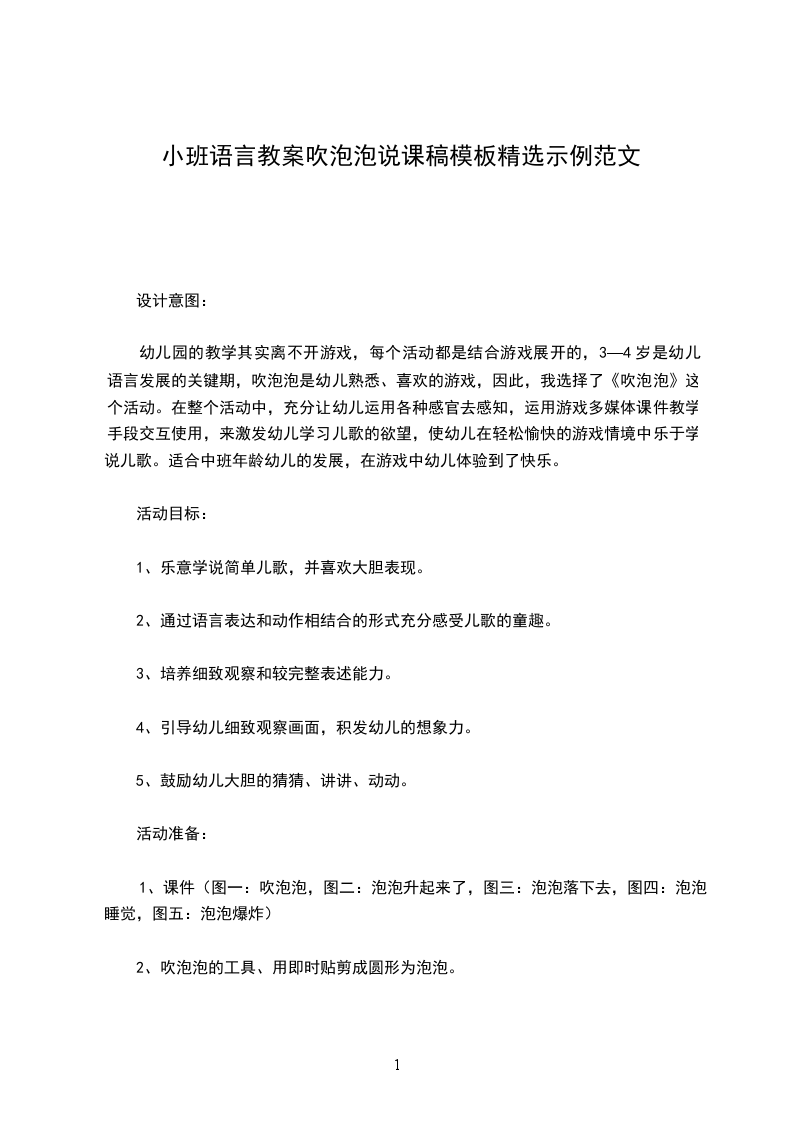 1、课件(图一:吹泡泡,图二:泡泡升起来了,图三:泡泡落下去,图四:泡泡睡觉,图五:泡泡爆炸)