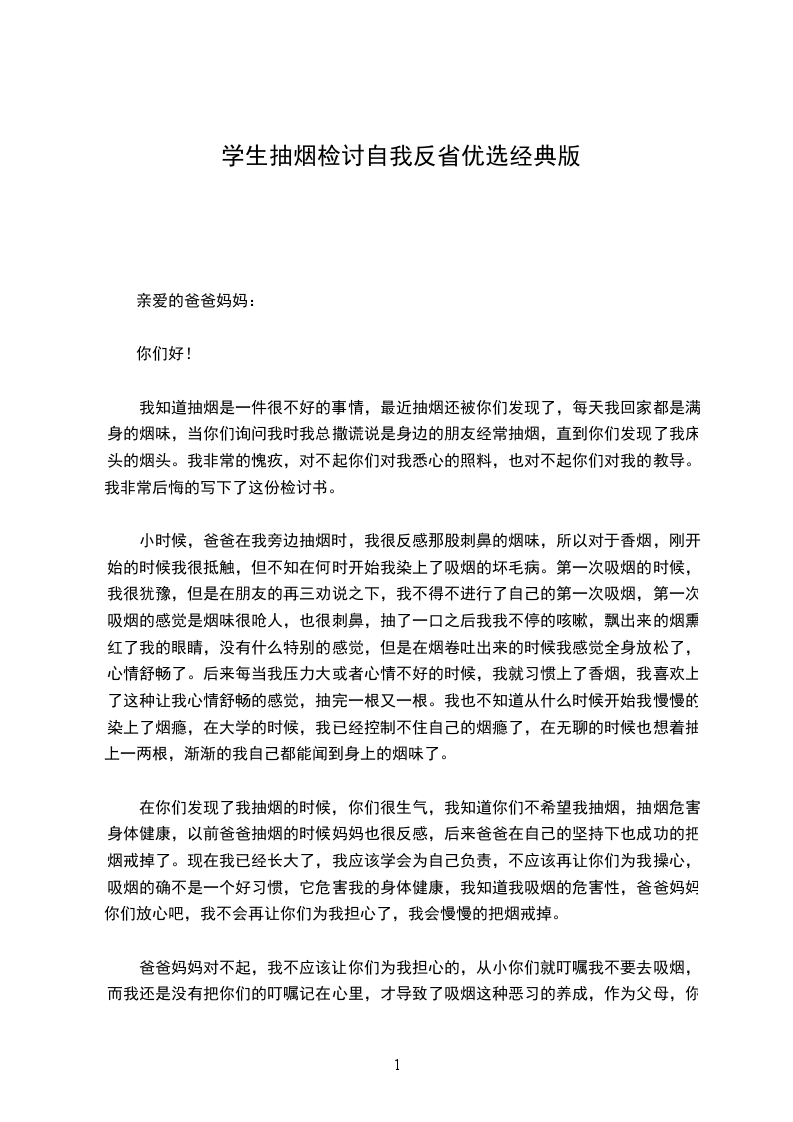 我知道抽烟是一件很不好的事情,最近抽烟还被你们发现了,每天我回家都是满身的烟味,当你们询问我时我总撒谎说是身边的朋友经常抽烟,直到你们发现了我床头的烟头。我非常的愧疚,对不起你们对我悉心的照料,也对不起你们对我的教导。我非常后悔的写下了这份检讨书。