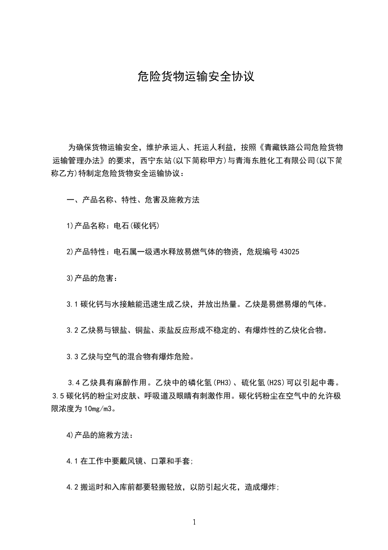 为确保货物运输安全,维护承运人、托运人利益,按照《青藏铁路公司危险货物运输管理办法》的要求,西宁东站(以下简称甲方)与青海东胜化工有限公司(以下简称乙方)特制定危险货物安全运输协议: