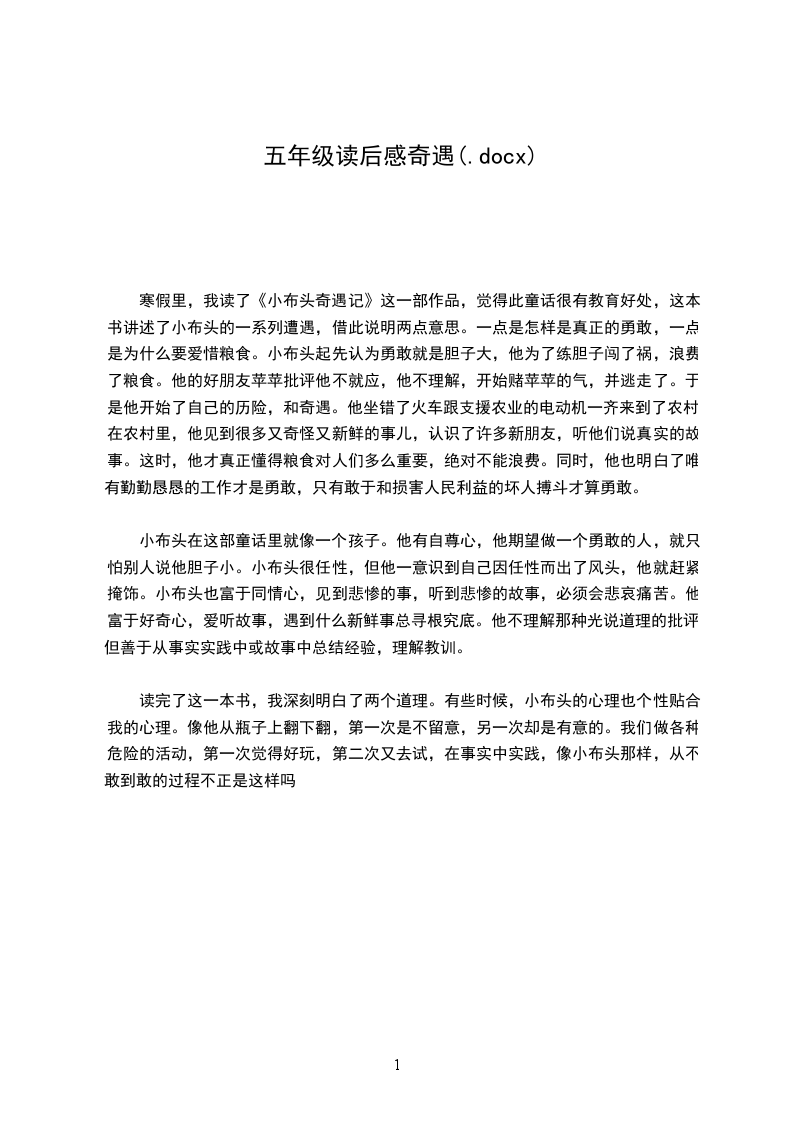 寒假里,我读了《小布头奇遇记》这一部作品,觉得此童话很有教育好处,这本书讲述了小布头的一系列遭遇,借此说明两点意思。一点是怎样是真正的勇敢,一点是为什么要爱惜粮食。小布头起先认为勇敢就是胆子大,他为了练胆子闯了祸,浪费了粮食。他的好朋友苹苹批评他不就应,他不理解,开始赌苹苹的气,并逃走了。于是他开始了自己的历险,和奇遇。他坐错了火车跟支援农业的电动机一齐来到了农村,在农村里,他见到很多又奇怪又新鲜的事儿,认识了许多新朋友,听他们说真实的故事。这时,他才真正懂得粮食对人们多么重要,绝对不能浪费。同时,他也明白了唯有勤勤恳恳的工作才是勇敢,只有敢于和损害人民利益的坏人搏斗才算勇敢。
