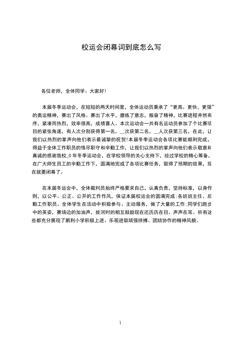 本届冬季运动会,在短短的两天时间里,全体运动员秉承了“更高、更快、更强”的奥运精神,赛出了风格、赛出了水平,磨炼了意志,振奋了精神,比赛进程井然有序,紧凑而热烈,效率很高,成绩喜人。本次运动会一共有名运动员参加了个比赛项目的紧张角逐,有人次分别获得第一名,__次获第二名,__人次获第三名,在此,让我们以热烈的掌声向他们表示最诚挚的祝贺!本届冬季运动会各项比赛能顺利完成,得益于全体工作职员的恪尽职守和辛勤工作,让我们以热烈的掌声向他们表示敬意和真诚的感谢我校_0年冬季运动会,在学校领导的关心支持下,经过学校的精心筹备,在广大师生员工的辛勤工作下,圆满地完成了各项比赛任务,取得了预期的效果,现在就要闭幕了。