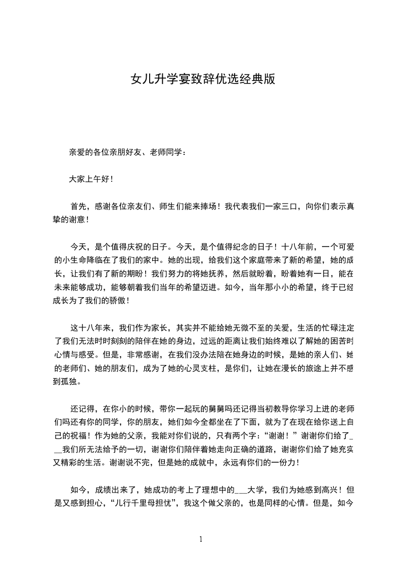 还记得,在你小的时候,带你一起玩的舅舅吗还记得当初教导你学习上进的老师们吗还有你的同学,你的朋友,她们如今全都坐在了下面,就为了在现在给你送上自己的祝福!作为她的父亲,我能对你们说的,只有两个字:“谢谢!”谢谢你们给了___我们所无法给予的一切,谢谢你们陪伴着她走向正确的道路,谢谢你们给了她充实又精彩的生活。谢谢说不完,但是她的成就中,永远有你们的一份力!