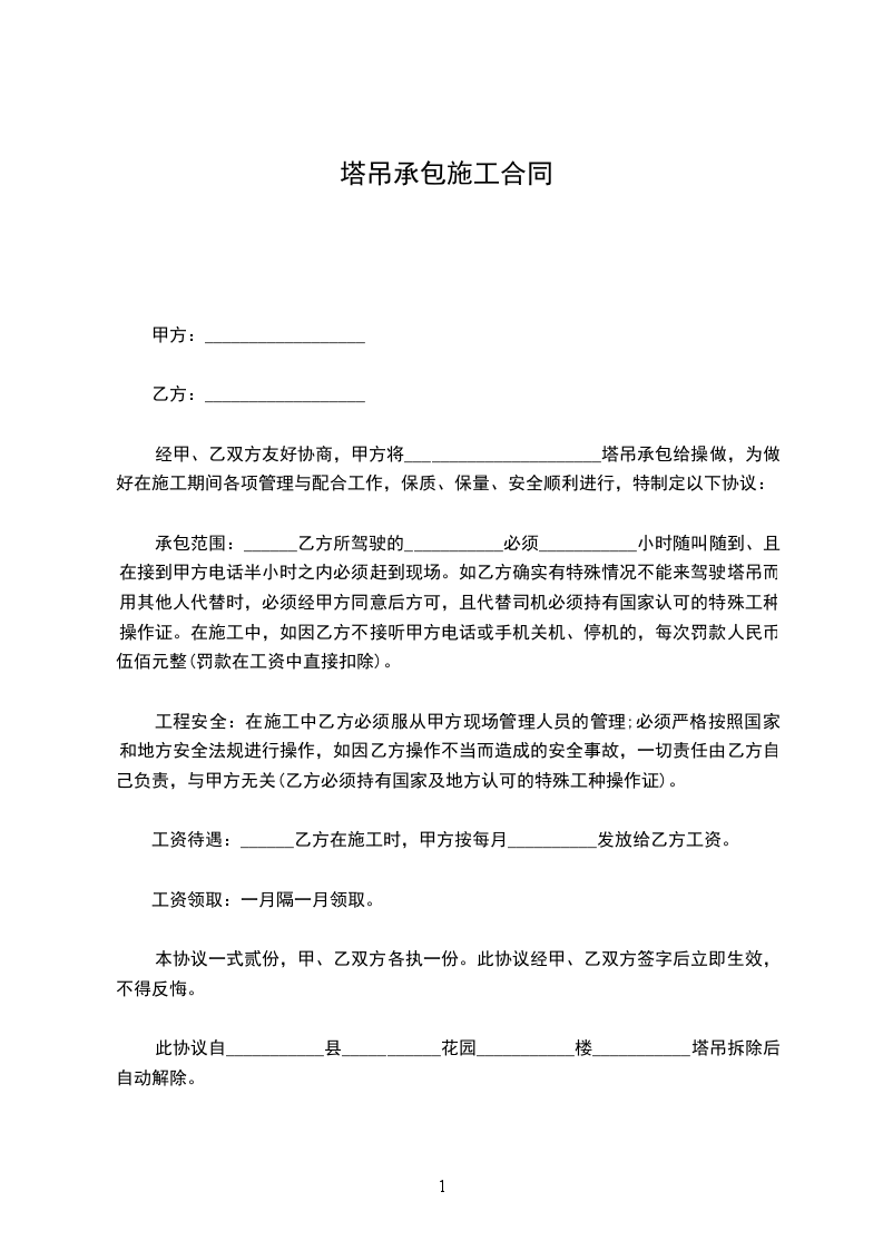 3、 为了保证塔吊司机认真负责的态度,项目部暂扣一个月工资,待承包合同解除后一次性付清全部工资。