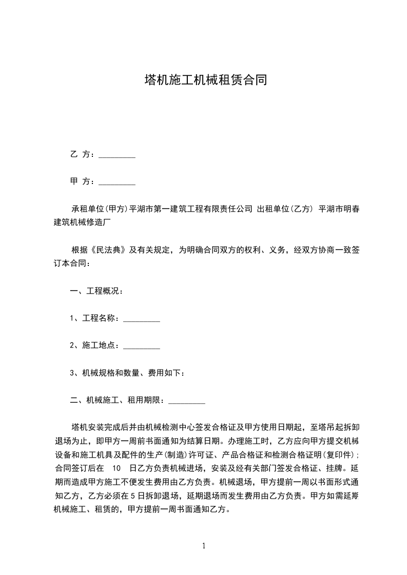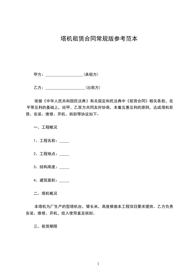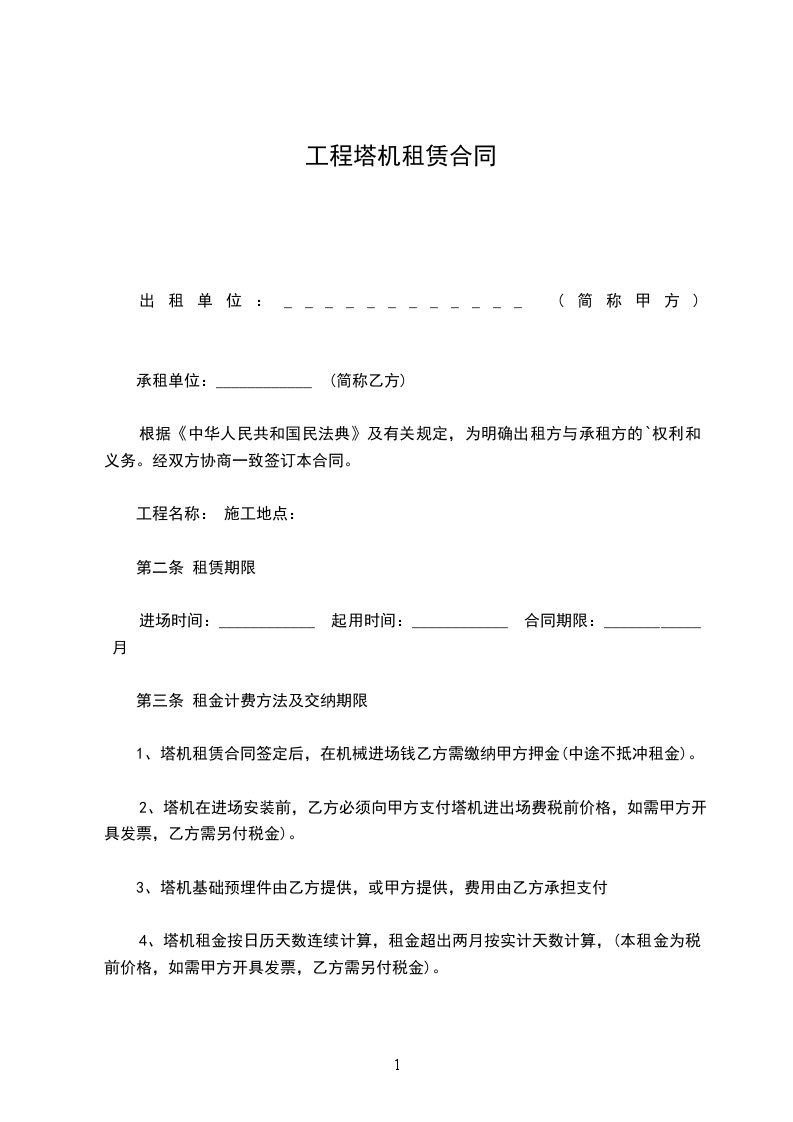乙方因___________工程建设需要,根据《中华人民共和国民法典》的规定,同甲方在平等、自愿、互惠、互利、协商、一致基础上,就租赁甲方塔机等相关设备设施达成如下一致协议条款,供双方共同遵守执行。