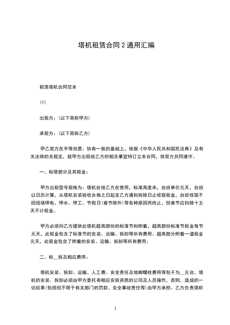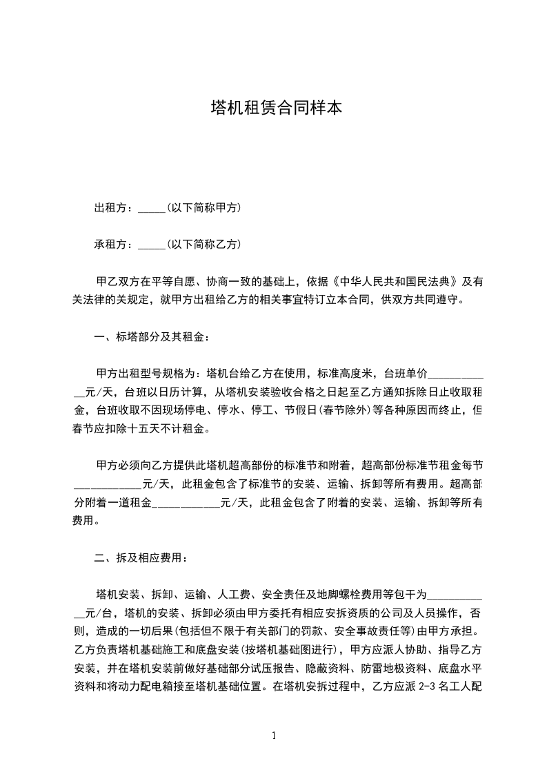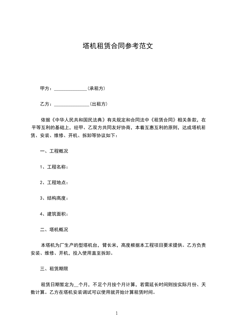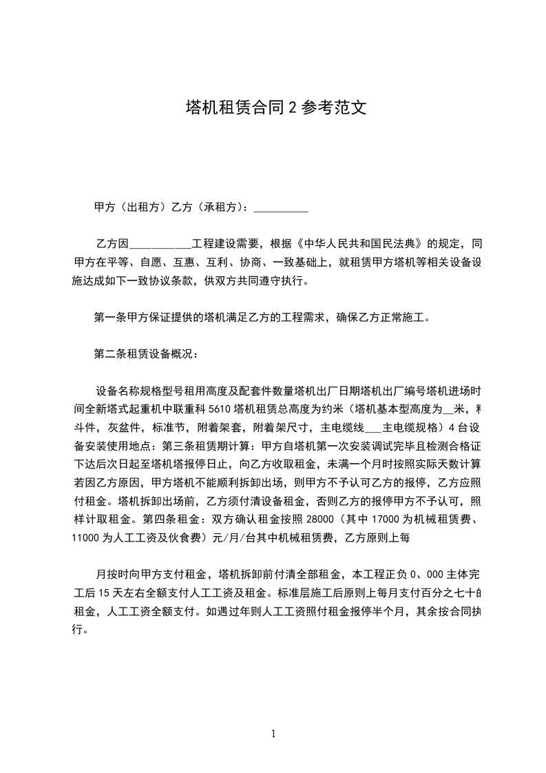 乙方因___________工程建设需要,根据《中华人民共和国民法典》的规定,同甲方在平等、自愿、互惠、互利、协商、一致基础上,就租赁甲方塔机等相关设备设施达成如下一致协议条款,供双方共同遵守执行。