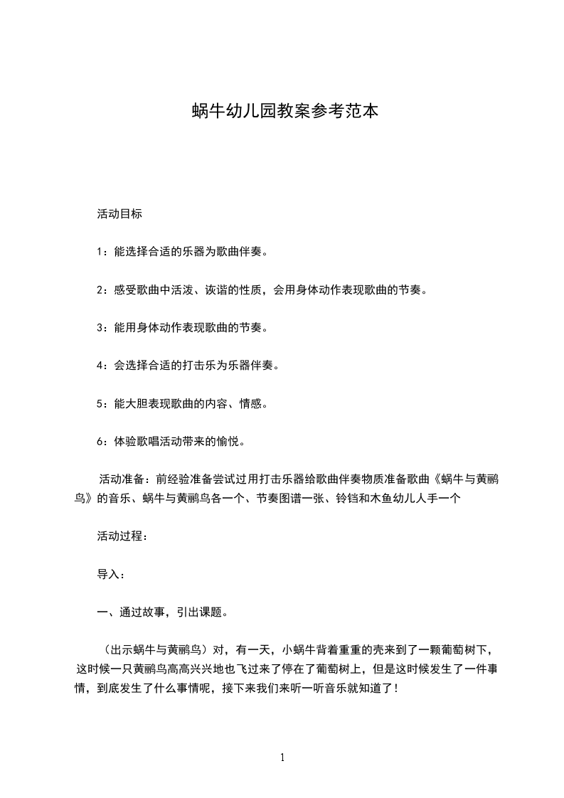 活动准备:前经验准备尝试过用打击乐器给歌曲伴奏物质准备歌曲《蜗牛与黄鹂鸟》的音乐、蜗牛与黄鹂鸟各一个、节奏图谱一张、铃铛和木鱼幼儿人手一个