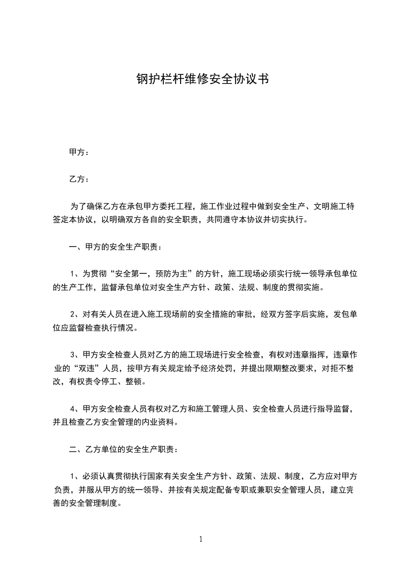 1、必须认真贯彻执行国家有关安全生产方针、政策、法规、制度,乙方应对甲方负责,并服从甲方的统一领导、并按有关规定配备专职或兼职安全管理人员,建立完善的安全管理制度。