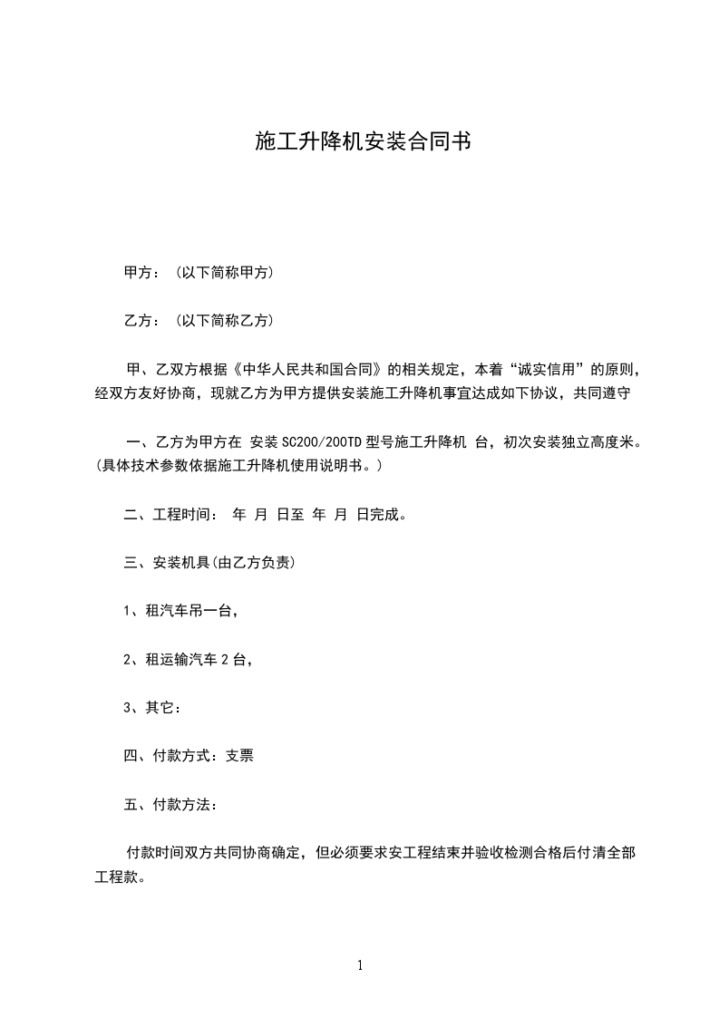 一、乙方为甲方在 安装SC200/200TD型号施工升降机 台,初次安装独立高度米。(具体技术参数依据施工升降机使用说明书。)