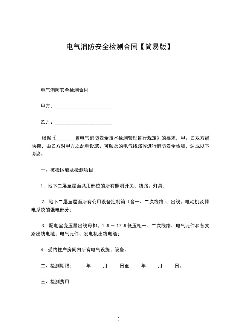 根据《陕西省电气消防安全技术检测管理暂行规定》的要求,甲、乙双方经协商,由乙方对甲方之配电设施、可触及的电气线路等进行消防安全检测,达成以下协议: