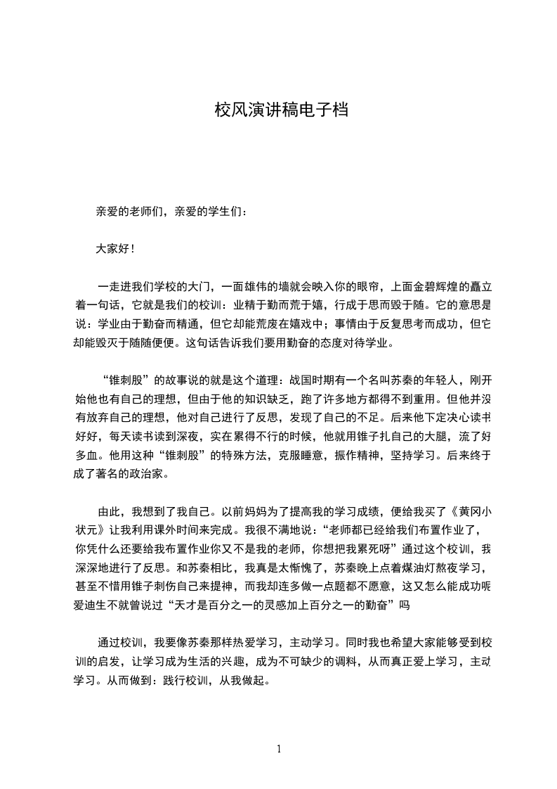 通过校训,我要像苏秦那样热爱学习,主动学习。同时我也希望大家能够受到校训的启发,让学习成为生活的兴趣,成为不可缺少的调料,从而真正爱上学习,主动学习。从而做到:践行校训,从我做起。