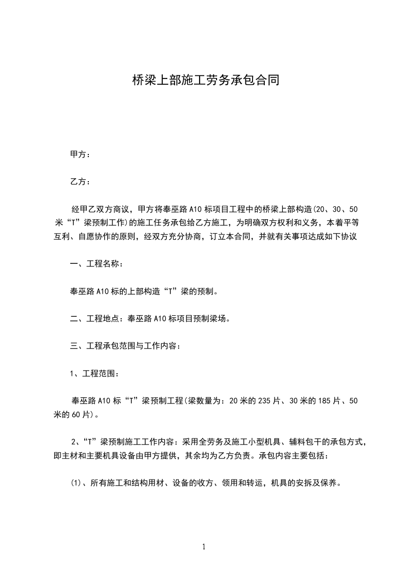 经甲乙双方商议,甲方将奉巫路A10标项目工程中的桥梁上部构造(20、30、50米“T”梁预制工作)的施工任务承包给乙方施工,为明确双方权利和义务,本着平等互利、自愿协作的原则,经双方充分协商,订立本合同,并就有关事项达成如下协议: