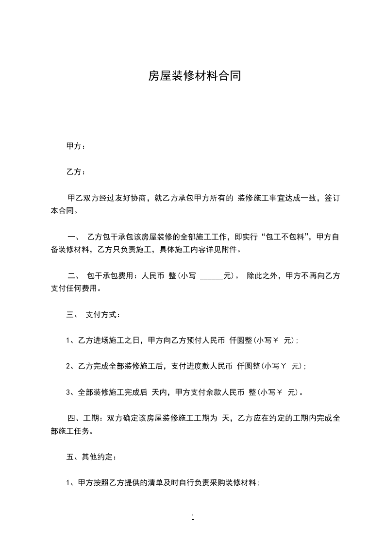 一、 乙方包干承包该房屋装修的全部施工工作,即实行“包工不包料”,甲方自备装修材料,乙方只负责施工,具体施工内容详见附件。