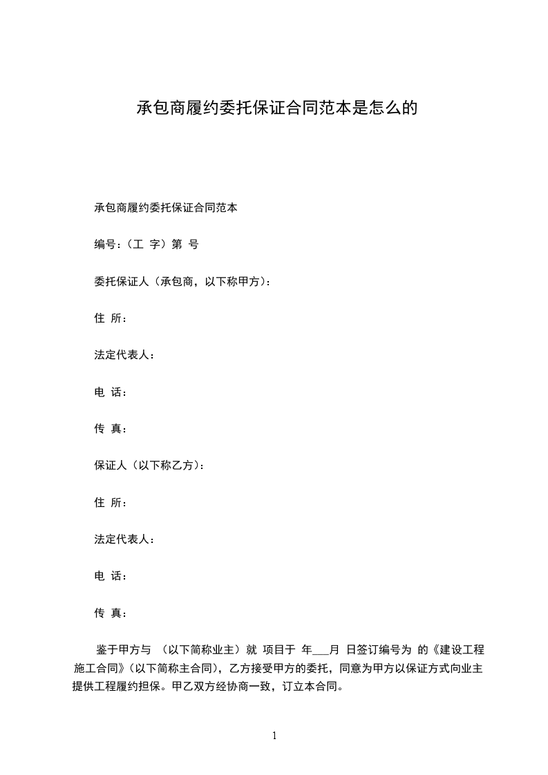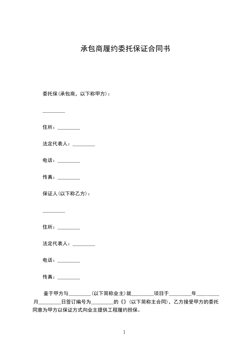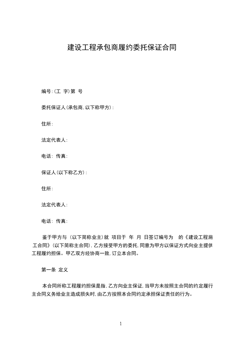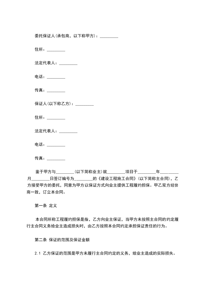 鉴于甲方与__________________(以下简称业主)就__________________项目于________年________月________日签订编号为________________的《建设工程施工合同》(以下简称主合同),乙方接受甲方的委托,同意为甲方以保证方式向业主提供工程履约担保。甲乙双方经协商一致,订立本合同。