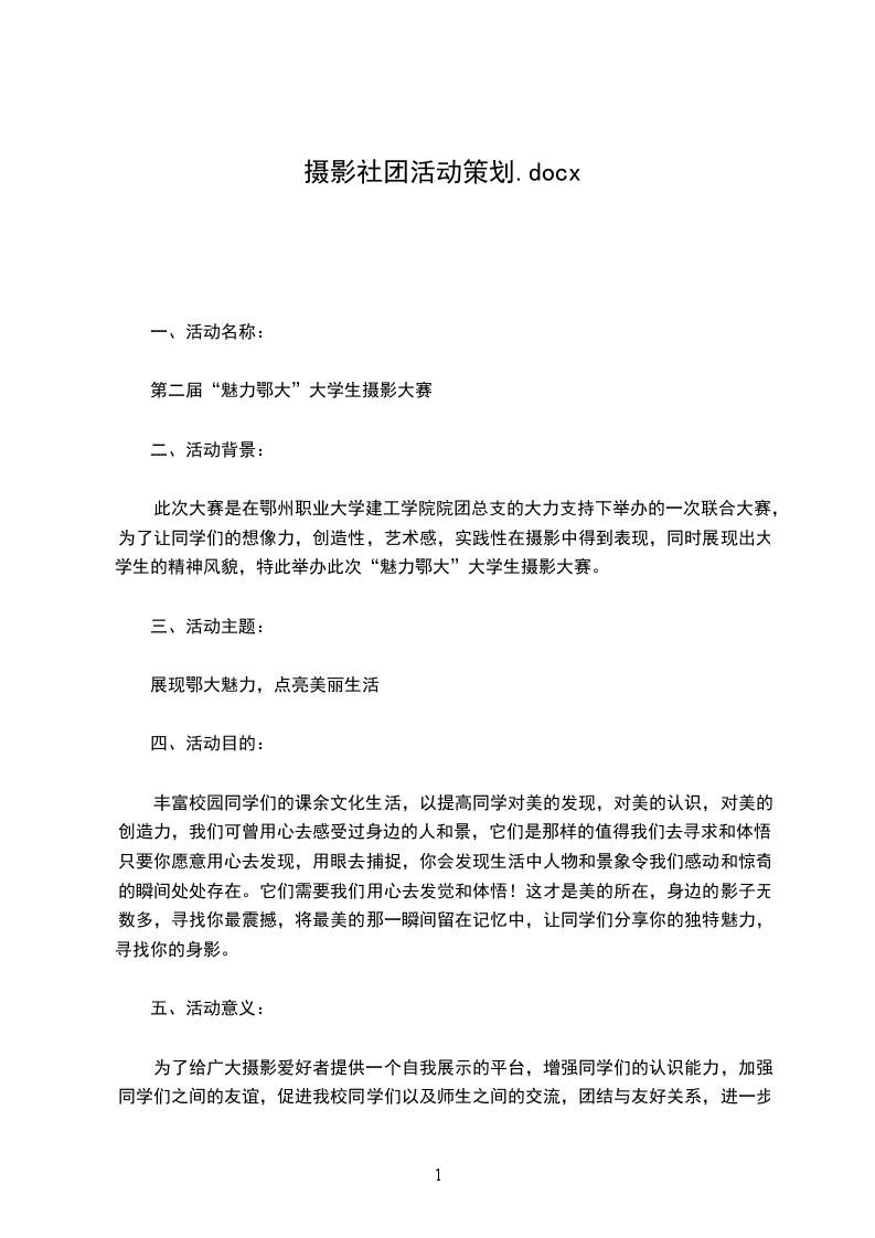2、中期工作:(1)给定时间,让参赛者去拍摄,以分组方式进行(鄂州风景)2—3或4—5人为一组,每组选一名组长,负责拍摄。可统一出去拍,也可自己去拍,且在11月21号前交上作品,每人六张照片(八寸彩色)且作品要有简介,以及作者姓名,院系,班级联系方式。参赛者在规定时间内需交上照片,及自备副照,用电脑放出图片进行评比;