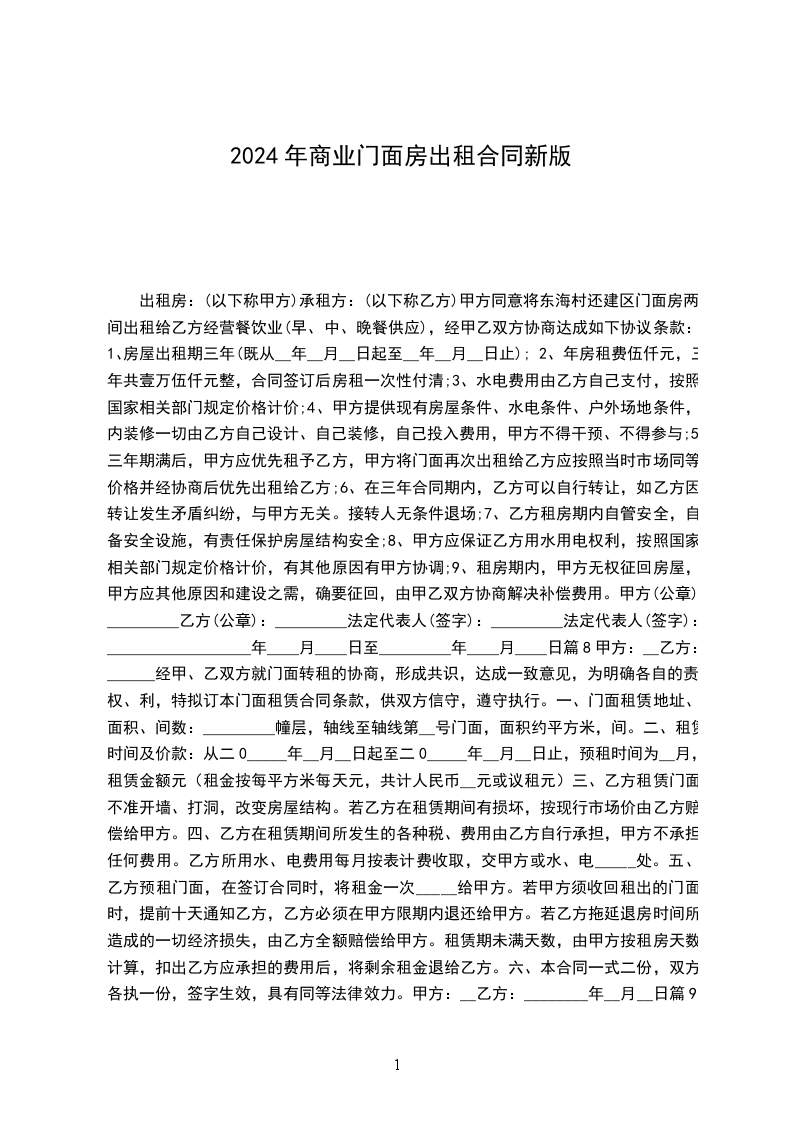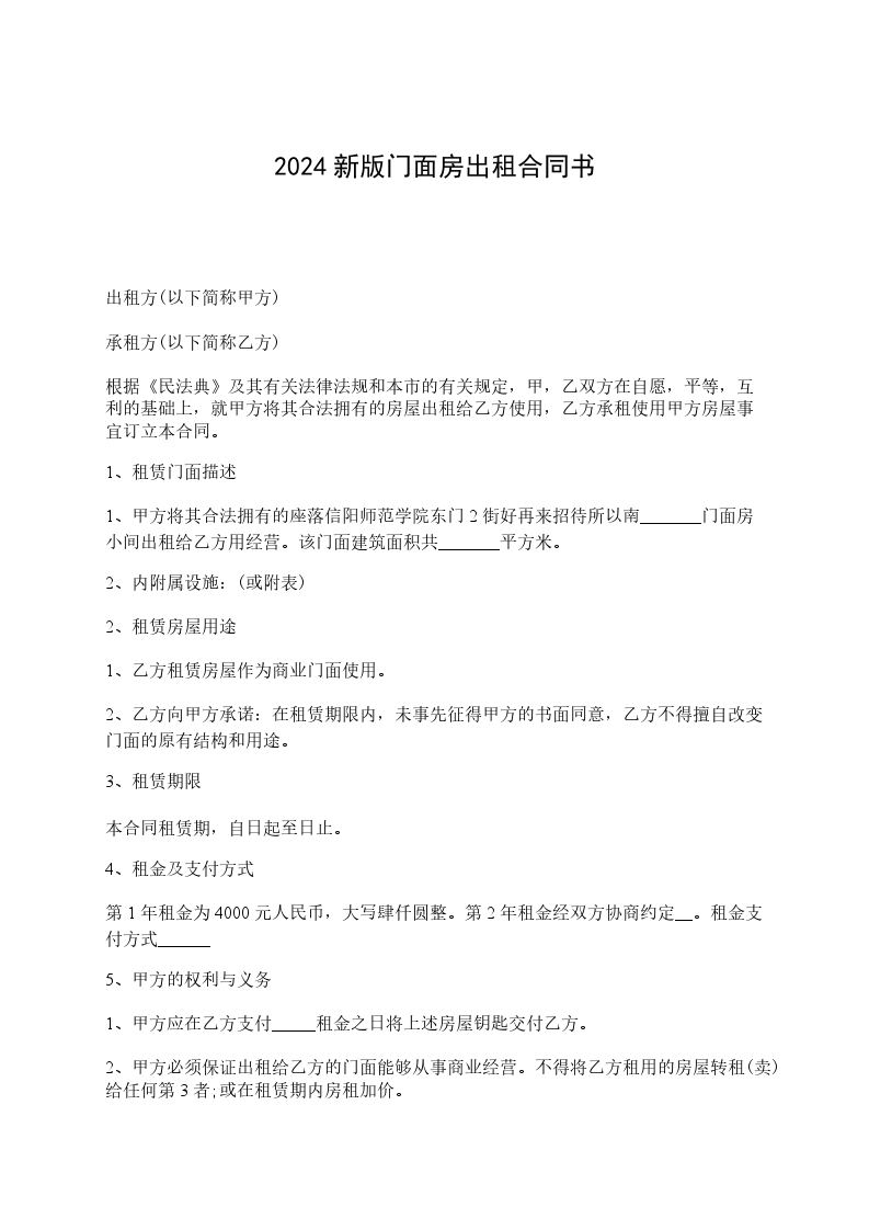 1.甲方将其合法拥有的座落于________街_______招待所以_____门面房小间出租给乙方用于经营。该门面建筑面积共_______平方米;