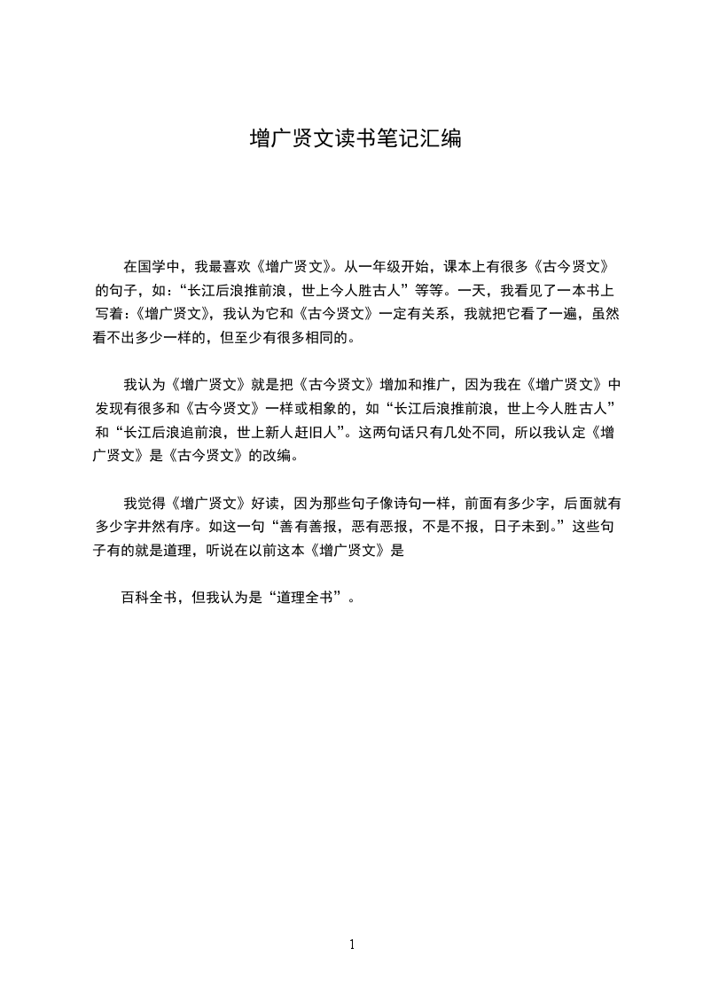 在国学中,我最喜欢《增广贤文》。从一年级开始,课本上有很多《古今贤文》的句子,如:“长江后浪推前浪,世上今人胜古人”等等。一天,我看见了一本书上写着:《增广贤文》,我认为它和《古今贤文》一定有关系,我就把它看了一遍,虽然看不出多少一样的,但至少有很多相同的。
