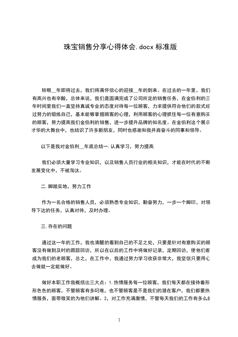 转眼__年即将过去,我们将满怀信心的迎接__年的到来。在过去的一年里,我们有高兴也有辛酸,总体来说,我们是圆满完成了公司所定的销售任务,在金伯利的三年时间里我们一直坚持真诚专业的态度对待每一位顾客,力求提供符合他们的款式经过努力的锻炼自己,基本能够掌握顾客的心理,利用顾客的心理抓住每一位有意购买的顾客,努力提高我们金伯利的销售,进一步提升品牌的知名度。在金伯利这个展示才华的大舞台中,也结识了许多新朋友,同时也感谢和我并肩奋斗的同事和领导。