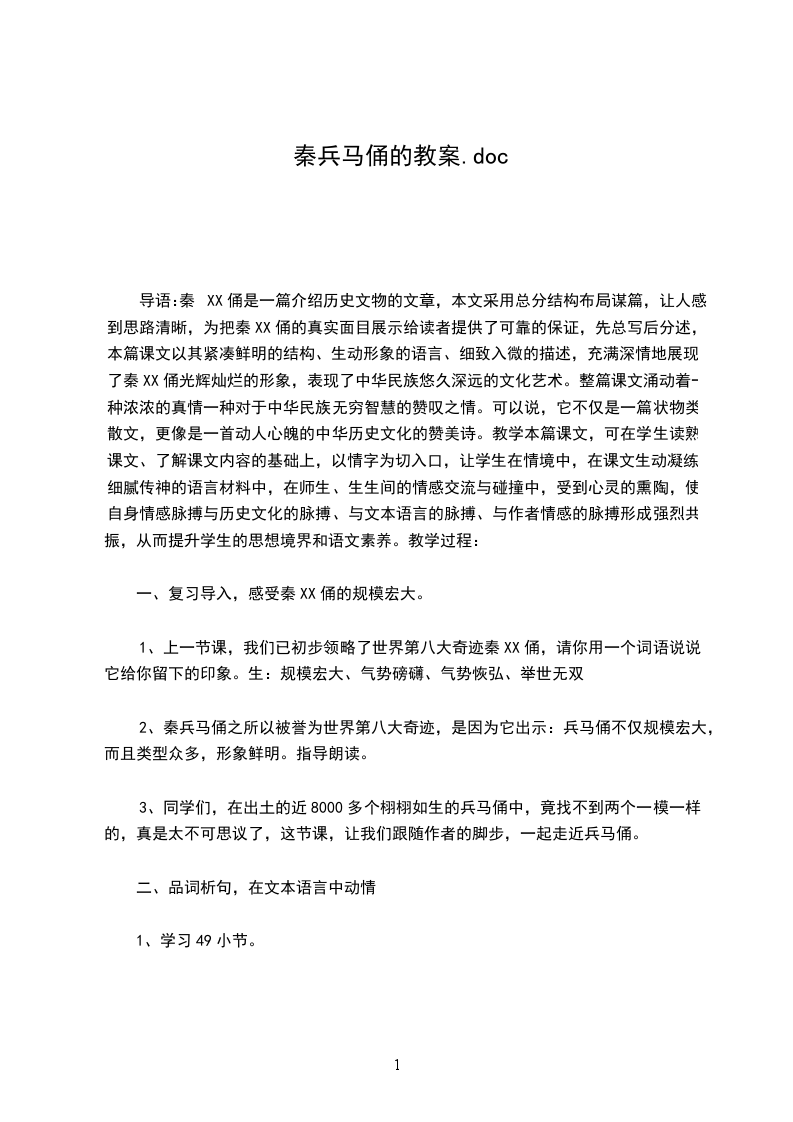 课文《秦兵马俑》是一篇状物类散文,生动地描绘了秦兵马俑规模宏大,类型众多,个性鲜明的特点,反映了中华民族的聪明才智,再现了中华民族一段辉煌的历史。这节课的教学重点是