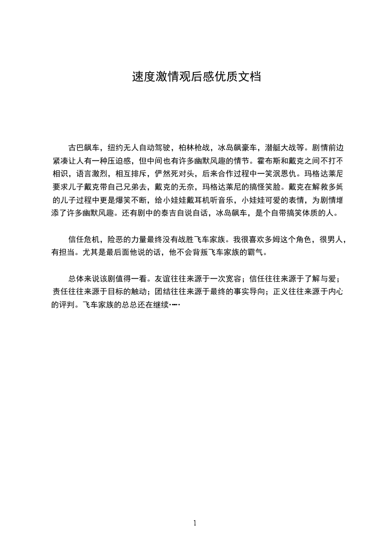 总体来说该剧值得一看。友谊往往来源于一次宽容;信任往往来源于了解与爱;责任往往来源于目标的触动;团结往往来源于最终的事实导向;正义往往来源于内心的评判。飞车家族的总总还在继续……