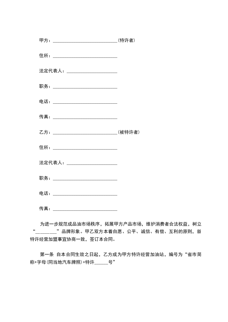 第一条 自本合同生效之日起,乙方成为甲方特许经营加油站,编号为“省市简称+字母(同当地汽车牌照)+特许______号”