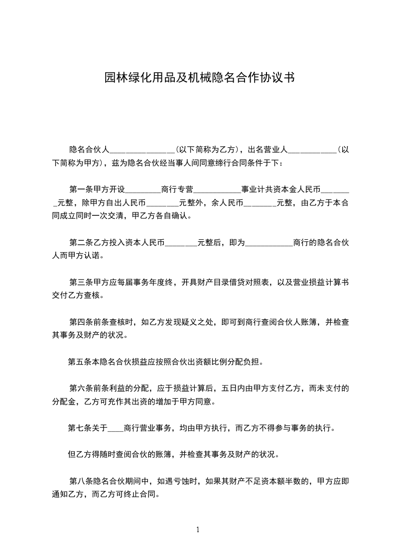 隐名合伙人________________(以下简称为乙方),出名营业人____________(以下简称为甲方),兹为隐名合伙经当事人间同意缔行合同条件于下: