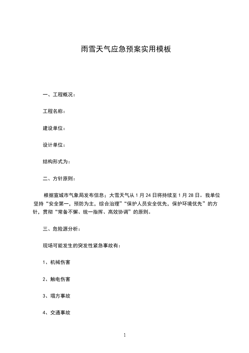 本应急预案适用于冬季阶段性大雪天气,项目部在建工程发生突发事件(事故)时的应急处理。