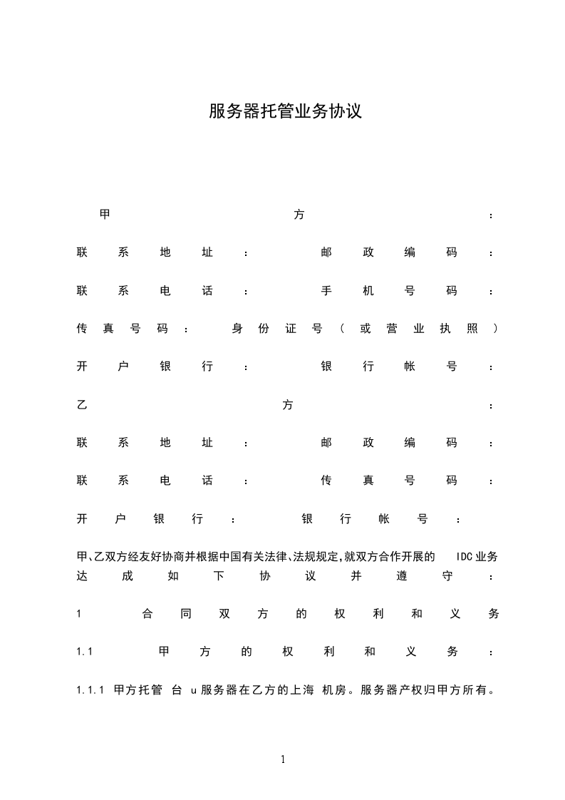 1.1.1 甲方托管 台 u服务器在乙方的上海 机房。服务器产权归甲方所有。