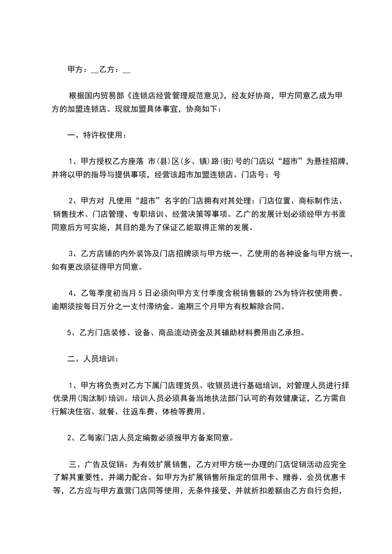 1、甲方授权乙方座落于 市(县) 区(乡、镇) 路(街) 号的门店以“H超市”为悬挂招牌,并将以甲的指导与提供事项,经营该超市加盟连锁店。