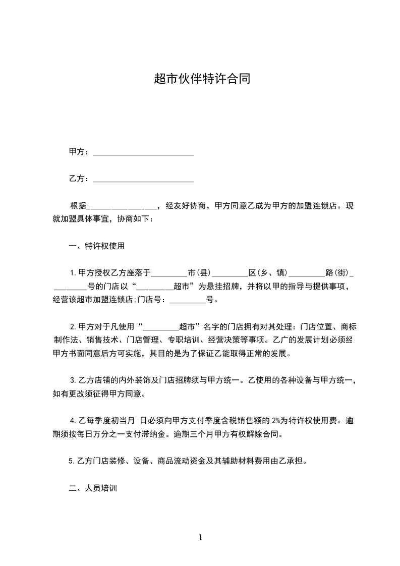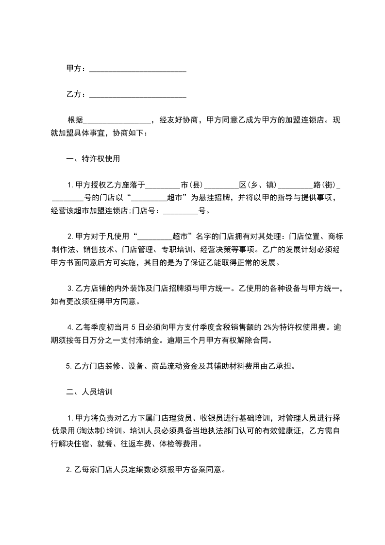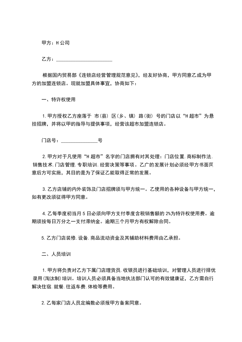 1、甲方授权乙方座落于市(县)区(乡、镇)路(街)号的门店以“H超市”为悬挂招牌,并将以甲的指导与提供事项,经营该超市加盟连锁店。