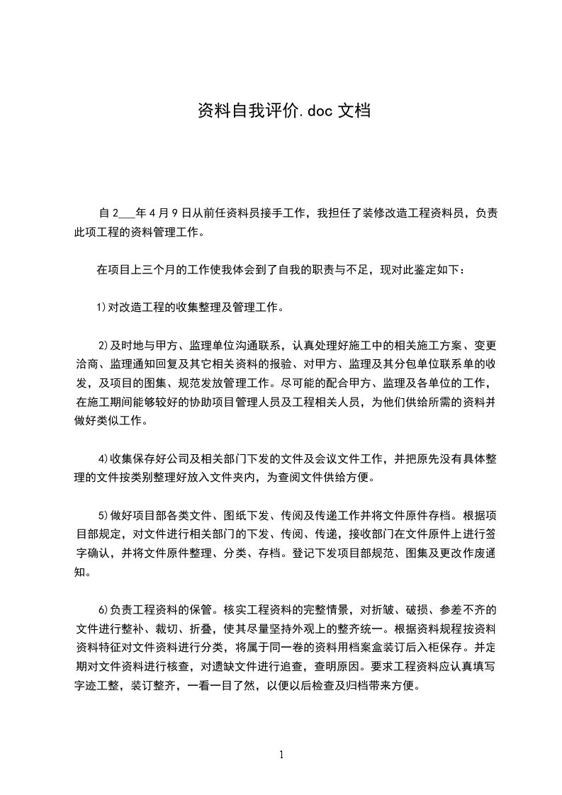 自2___年4月9日从前任资料员接手工作,我担任了装修改造工程资料员,负责此项工程的资料管理工作。