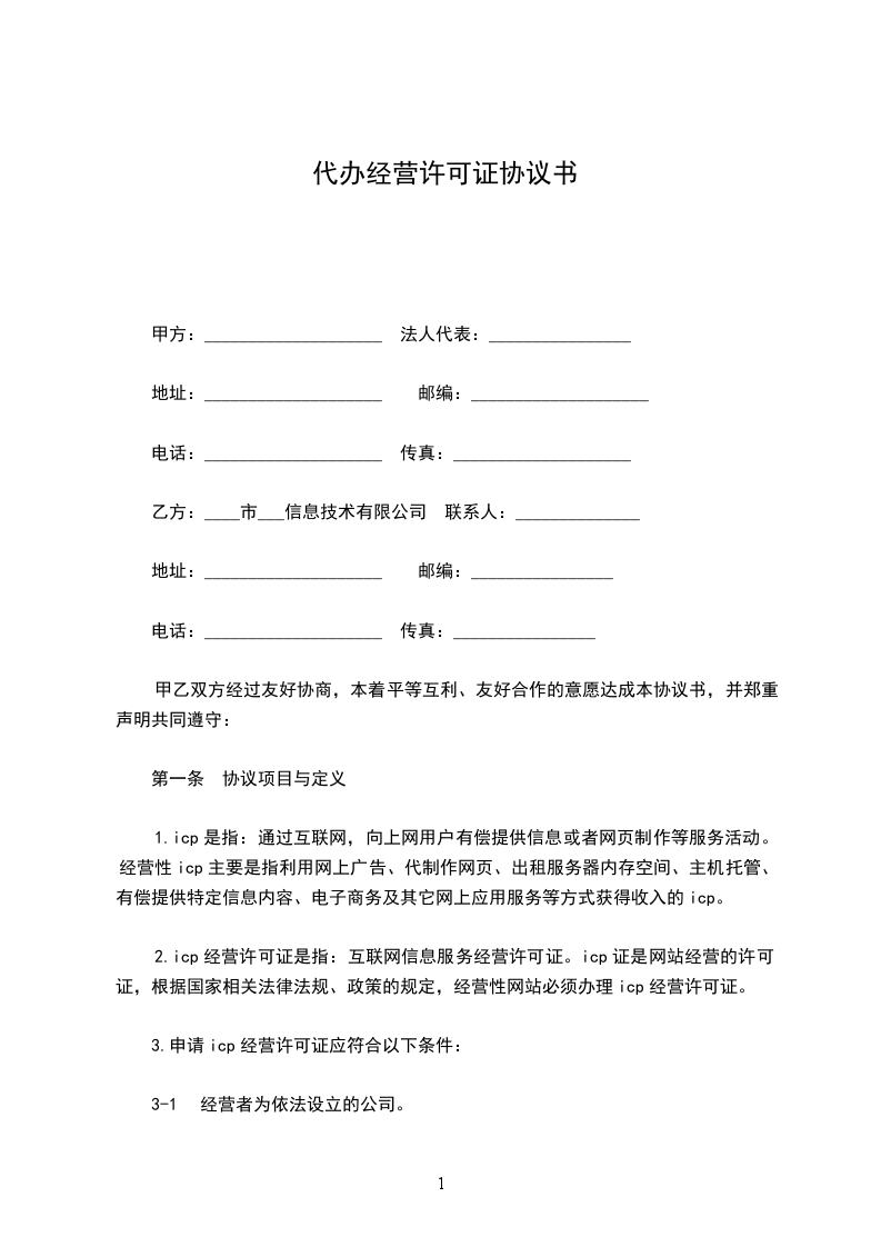 1-1 协议期内,通过电话或电子邮件的方式,在协议附件约定范围内对甲方申办icp经营许可证的有关问题进行指导和解答。