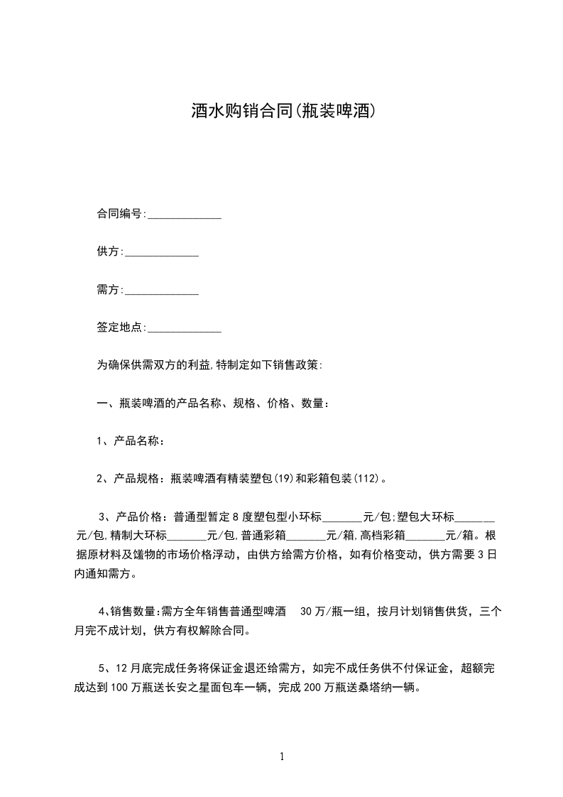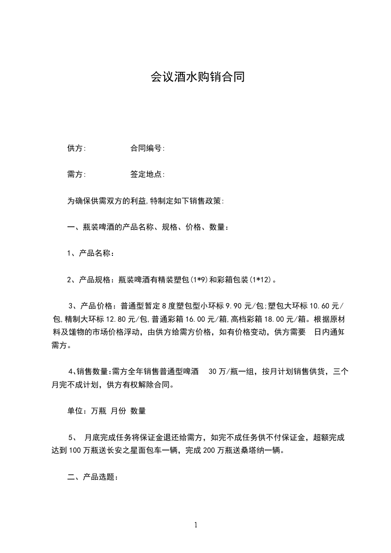 5、 月底完成任务将保证金退还给需方,如完不成任务供不付保证金,超额完成达到100万瓶送长安之星面包车一辆,完成200万瓶送桑塔纳一辆。
