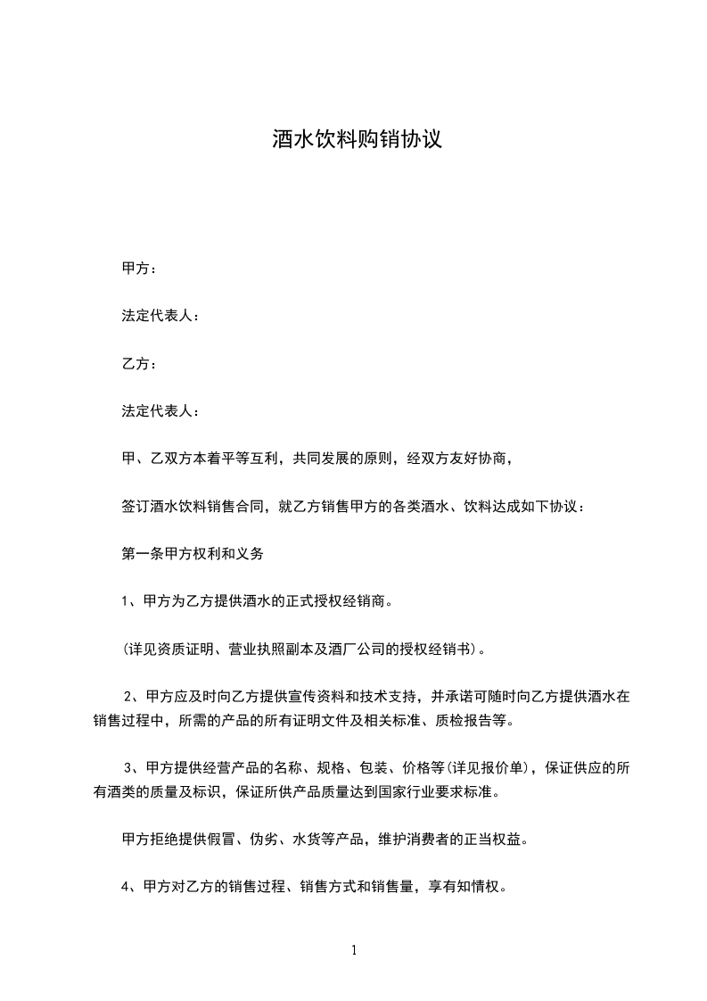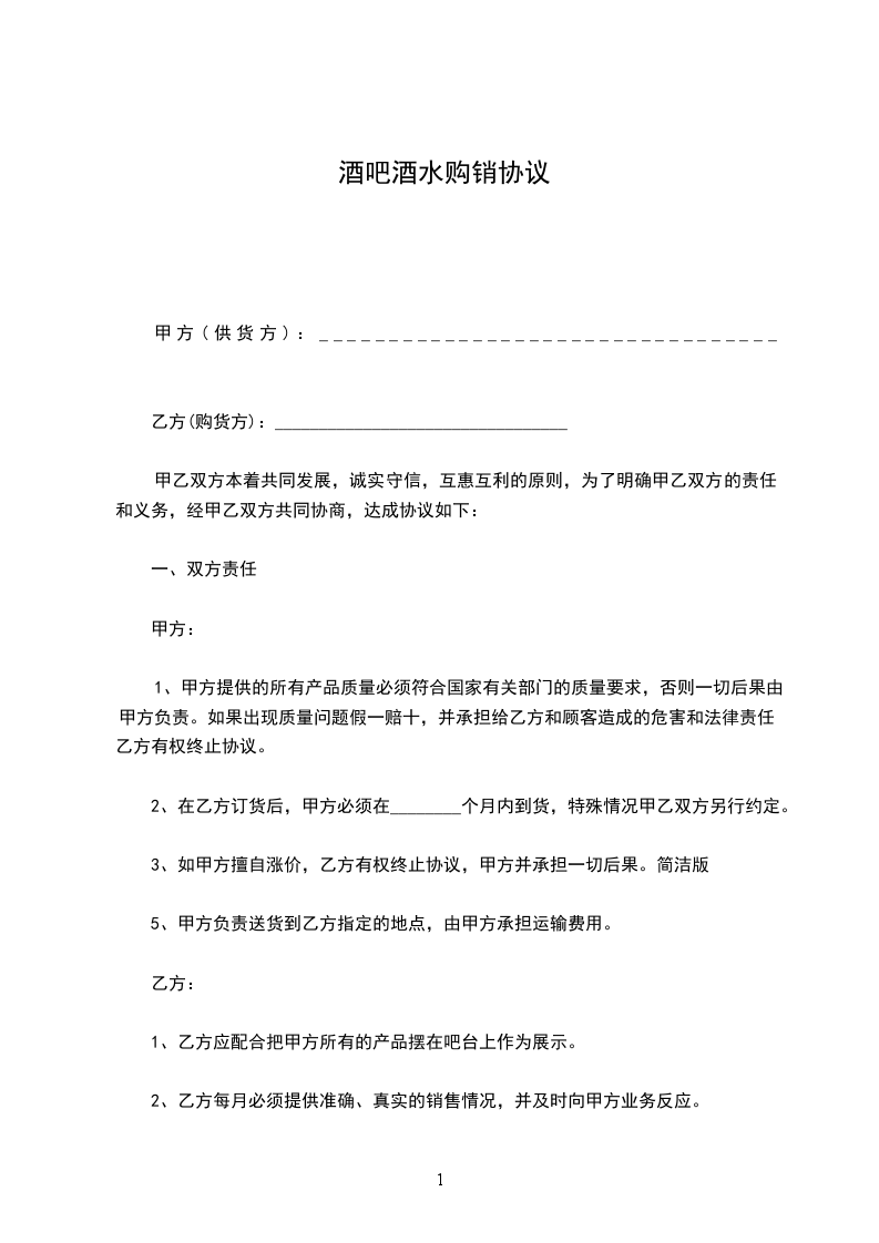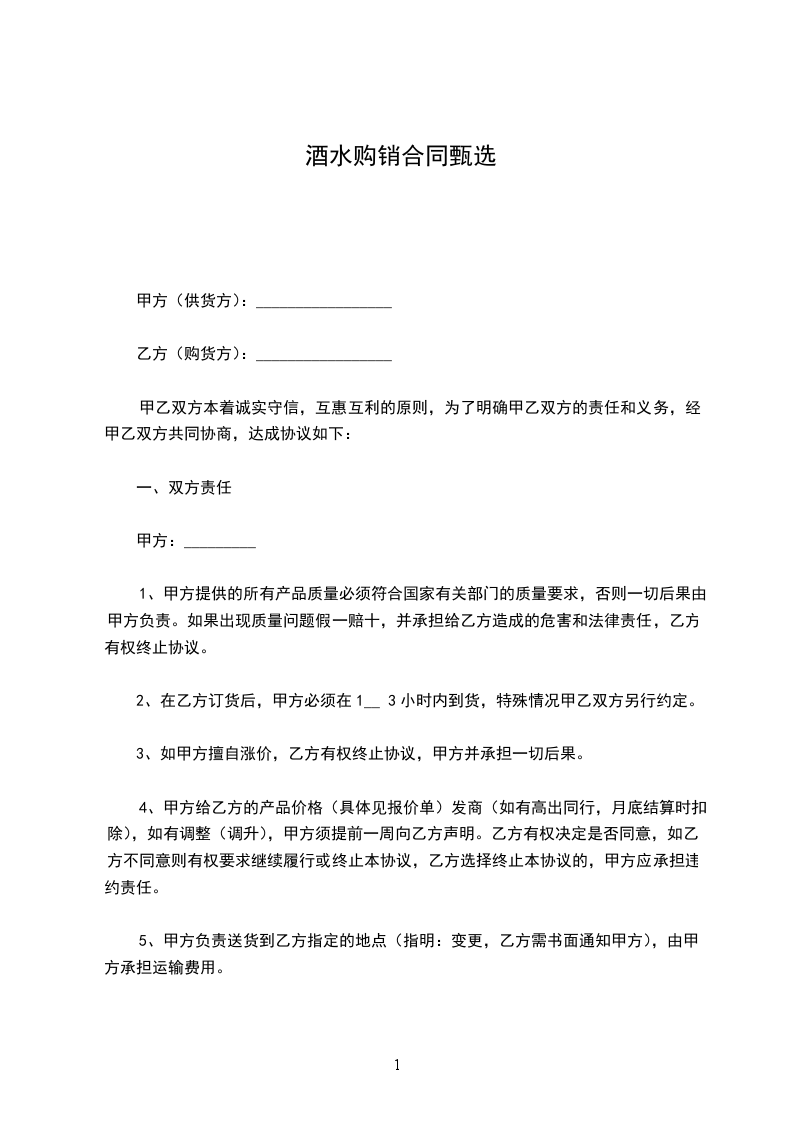 系列啤酒指定(市、区)一家总代理,未经供方许可,需方不得自行转让普通买卖合同,否则则视合同无效。需方在合同约定的县、市、地区内销售,不得冲击其它县、市市场。在所销售区域内销售价格必须统一,不得降价销售,否则供方有权单方终止合同或采取惩罚措施,扣留全年返利和保证金。