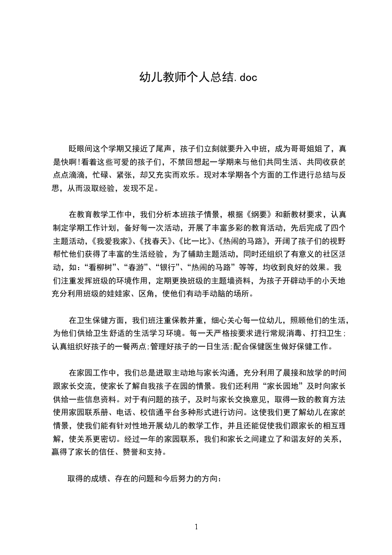 一个学期以来,我与家长们相处得很愉快,工作得到了家长们的一致认可和表扬。平时,经常通过面谈的形式来与家长们交流教育心得,交流幼儿在家、在园的表现情况,共同寻找出教育幼儿的方法,仔细聆听家长们的意见和看法。其次。按时更换家园联系栏。给家长们提供的幼教咨讯。班上的各项活动需要家长支持时,家长们都给予了的支持。