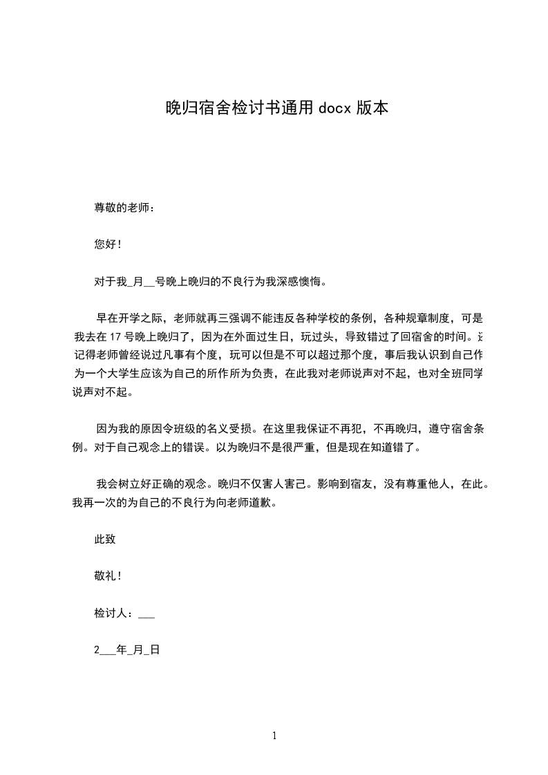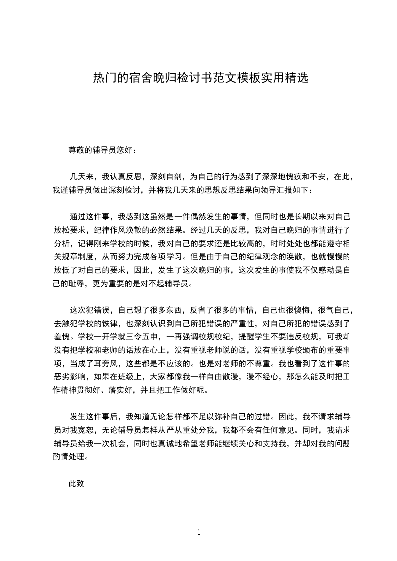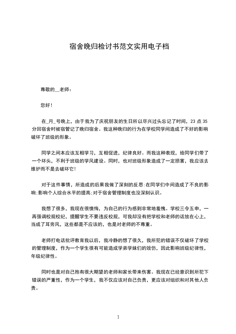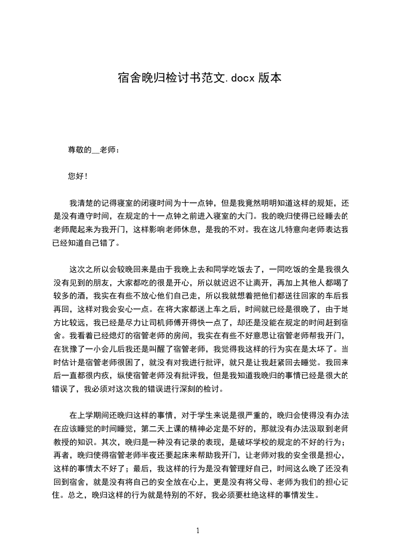 这次之所以会较晚回来是由于我晚上去和同学吃饭去了,一同吃饭的全是我很久没有见到的朋友,大家都吃的很是开心,所以就迟迟不让离开,再加上其他人都喝了较多的酒,我实在有些不放心他们自己走,所以我就想着把他们都送往回家的车后我再回,这样对我会安心一点。在将大家都送上车之后,时间就已经是很晚了,由于地方比较远,我已经是尽力让司机师傅开得快一点了,却还是没能在规定的时间赶到宿舍。我看着已经熄灯的宿管老师的房间,我实在有些不好意思让宿管老师帮我开门,在犹豫了一小会儿后我还是叫醒了宿管老师,我觉得我这样的行为实在是太坏了。当时估计是宿管老师很困了,就没有对我进行批评,就只是让我赶紧回去睡觉。我回来后一直都很内疚,纵使宿管老师没有批评我,但是我知道我晚归的事情已经是很大的错误了,我必须对这次我的错误进行深刻的检讨。
