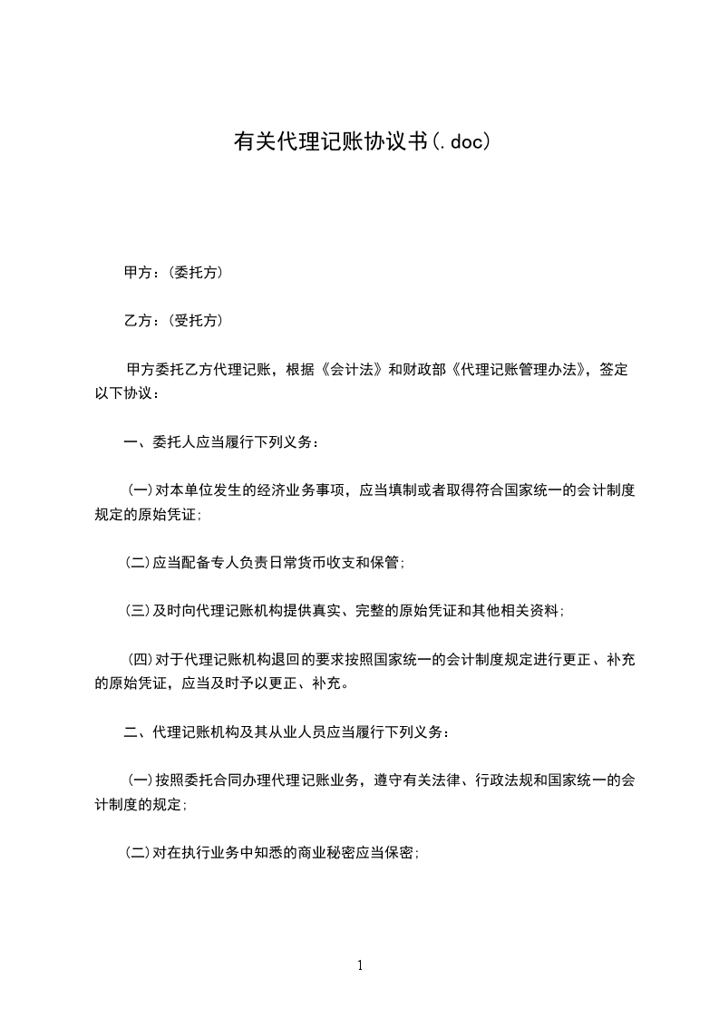 甲方委托乙方代理记账,根据《会计法》和财政部《代理记账管理办法》,签定以下协议: