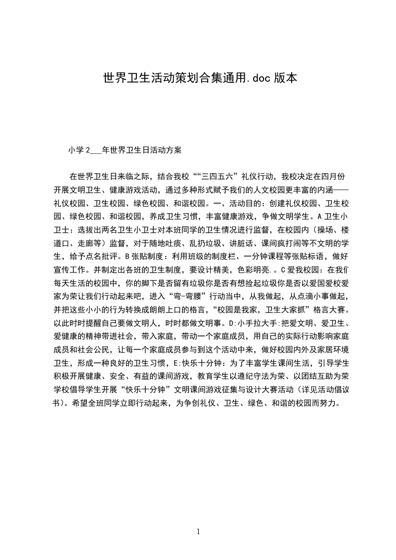 在世界卫生日来临之际,结合我校““三四五六”礼仪行动,我校决定在四月份开展文明卫生、健康游戏活动,通过多种形式赋予我们的人文校园更丰富的内涵——礼仪校园、卫生校园、绿色校园、和谐校园。一、活动目的:创建礼仪校园、卫生校园、绿色校园、和谐校园,养成卫生习惯,丰富健康游戏,争做文明学生。A卫生小卫士:选拔出两名卫生小卫士对本班同学的卫生情况进行监督,在校园内(操场、楼道口、走廊等)监督,对于随地吐痰、乱扔垃圾、讲脏话、课间疯打闹等不文明的学生,给予点名批评。B张贴制度:利用班级的制度栏、一分钟课程等张贴标语,做好宣传工作。并制定出各班的卫生制度,要设计精美,色彩明亮.。C爱我校园:在我们每天生活的校园中,你的脚下是否留有垃圾你是否有想捡起垃圾你是否以爱国爱校爱家为荣让我们行动起来吧,进入“弯-弯腰”行动当中,从我做起,从点滴小事做起,并把这些小小的行为转换成朗朗上口的格言,“校园是我家,卫生大家抓”格言大赛。以此时时提醒自己要做文明人,时时都做文明事。D:小手拉大手:把爱文明、爱卫生、爱健康的精神带进社会,带入家庭,带动一个家庭成员,用自己的实际行动影响家庭成员和社会公民,让每一个家庭成员参与到这个活动中来,做好校园内外及家居环境卫生,形成一种良好的卫生习惯,E:快乐十分钟:为了丰富学生课间生活,引导学生积极开展健康、安全、有益的课间游戏,教育学生以遵纪守法为荣、以团结互助为荣,学校倡导学生开展“快乐十分钟”文明课间游戏征集与设计大赛活动(详见活动倡议书)。希望全班同学立即行动起来,为争创礼仪、卫生、绿色、和谐的校园而努力。
