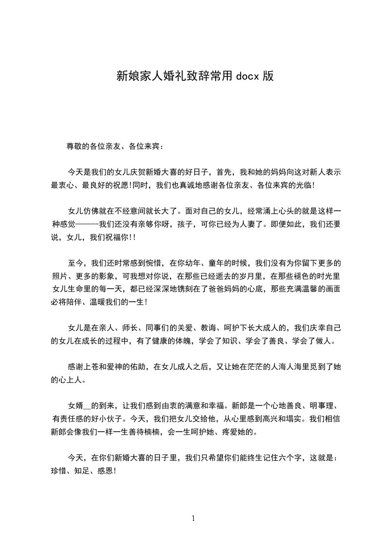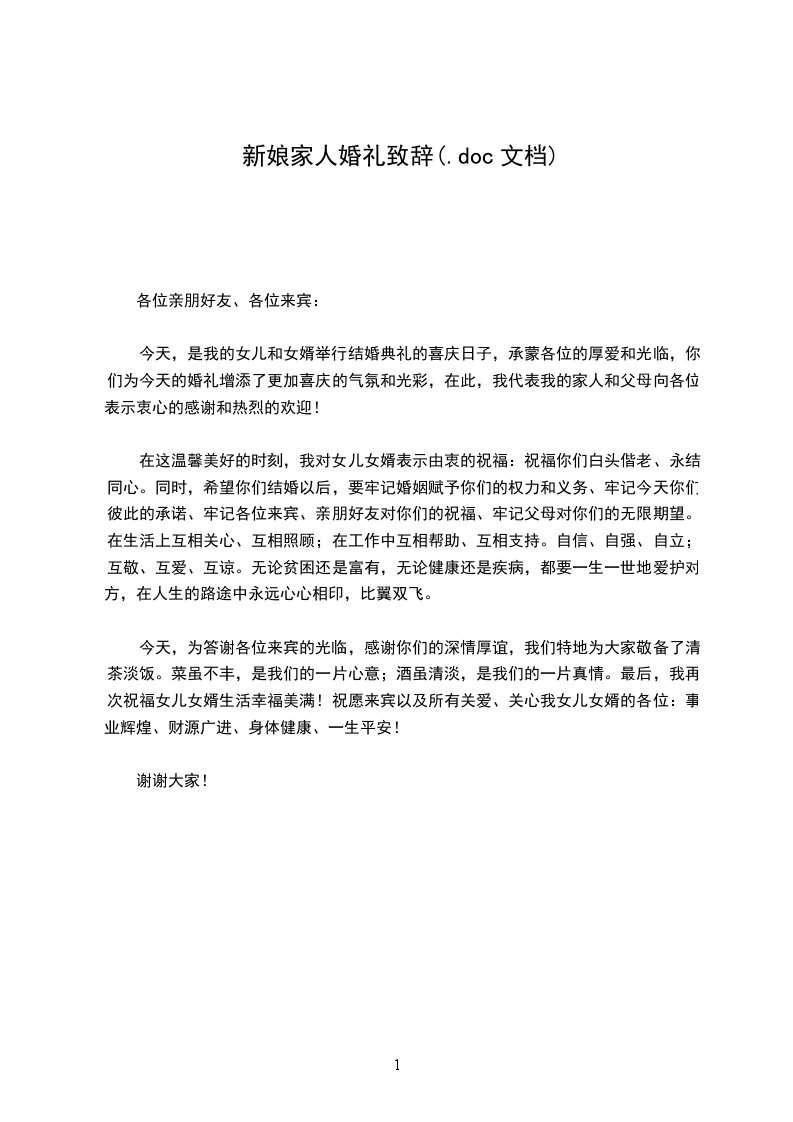 大家好!今天是我女儿__,女婿__喜结良缘的日子,非常感谢各位能够来到这里为我的女儿女婿祝福,我和我的爱人__代表我们全家对各位表示热烈的欢迎和衷心的感谢。