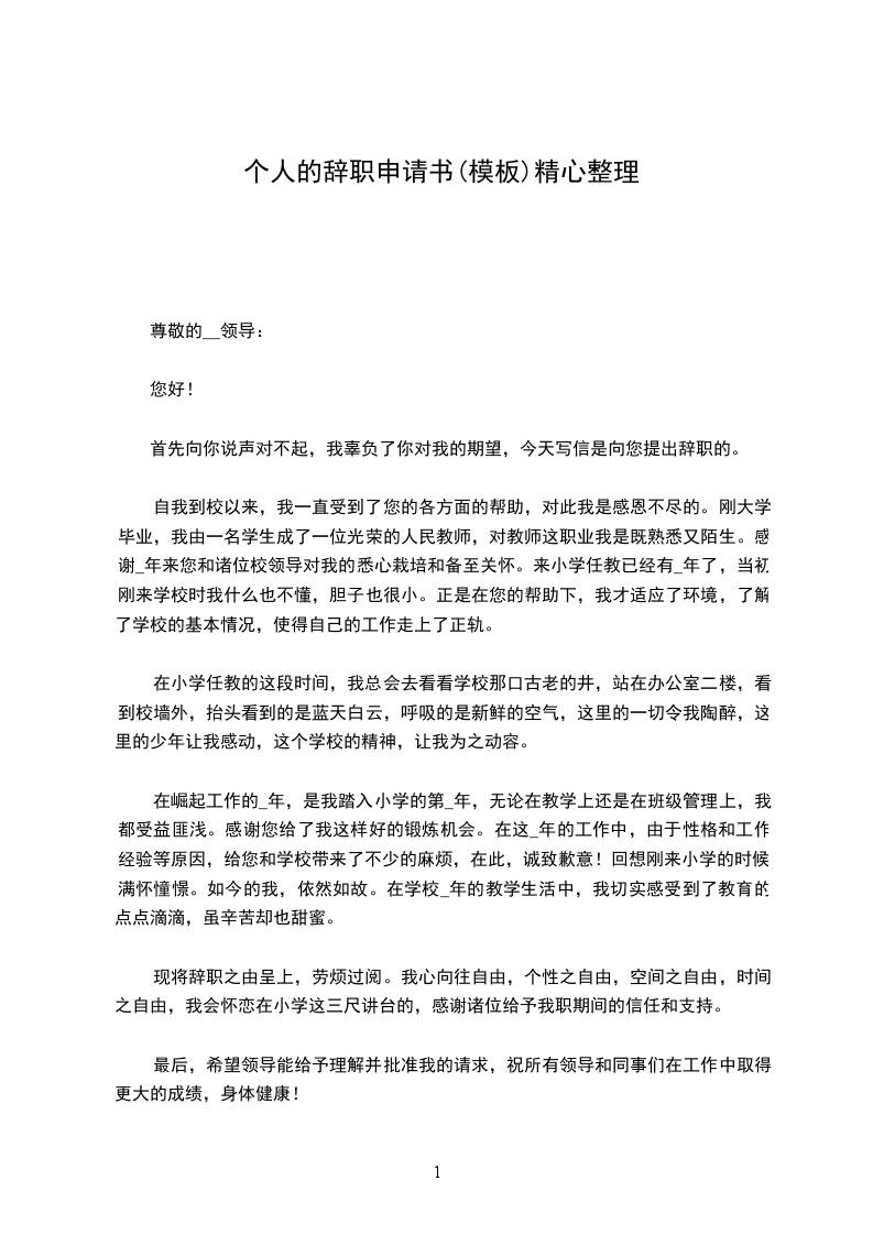 现将辞职之由呈上,劳烦过阅。我心向往自由,个性之自由,空间之自由,时间之自由,我会怀恋在小学这三尺讲台的,感谢诸位给予我职期间的信任和支持。