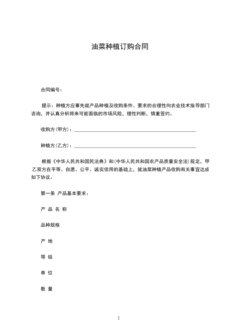 根据《中华人民共和国民法典》和(中华人民共和国农产品质量安全法)规定,甲乙双方在平等、自愿、公平、诚实信用的基础上,就油菜种植产品收购有关事宜达成如下协议。