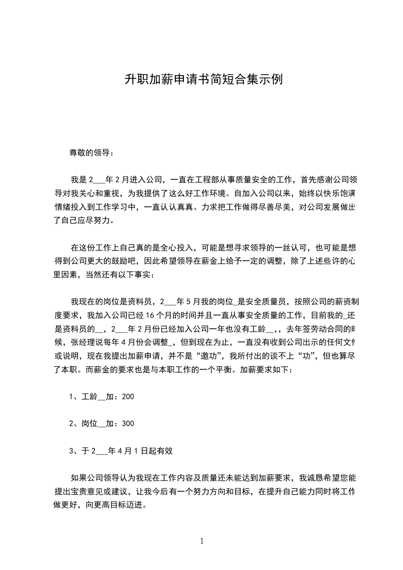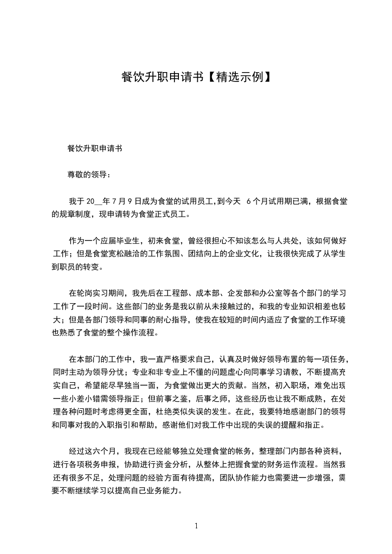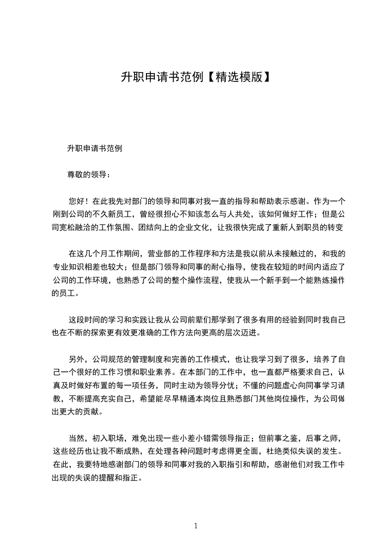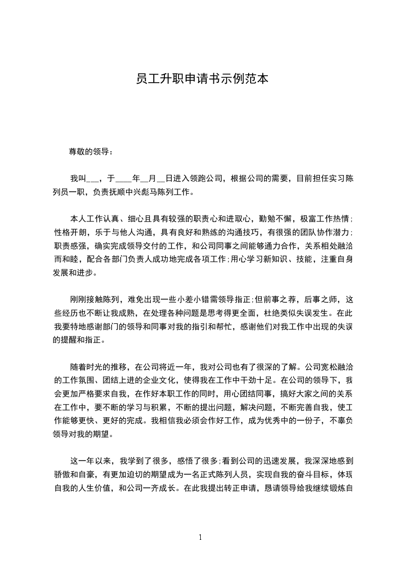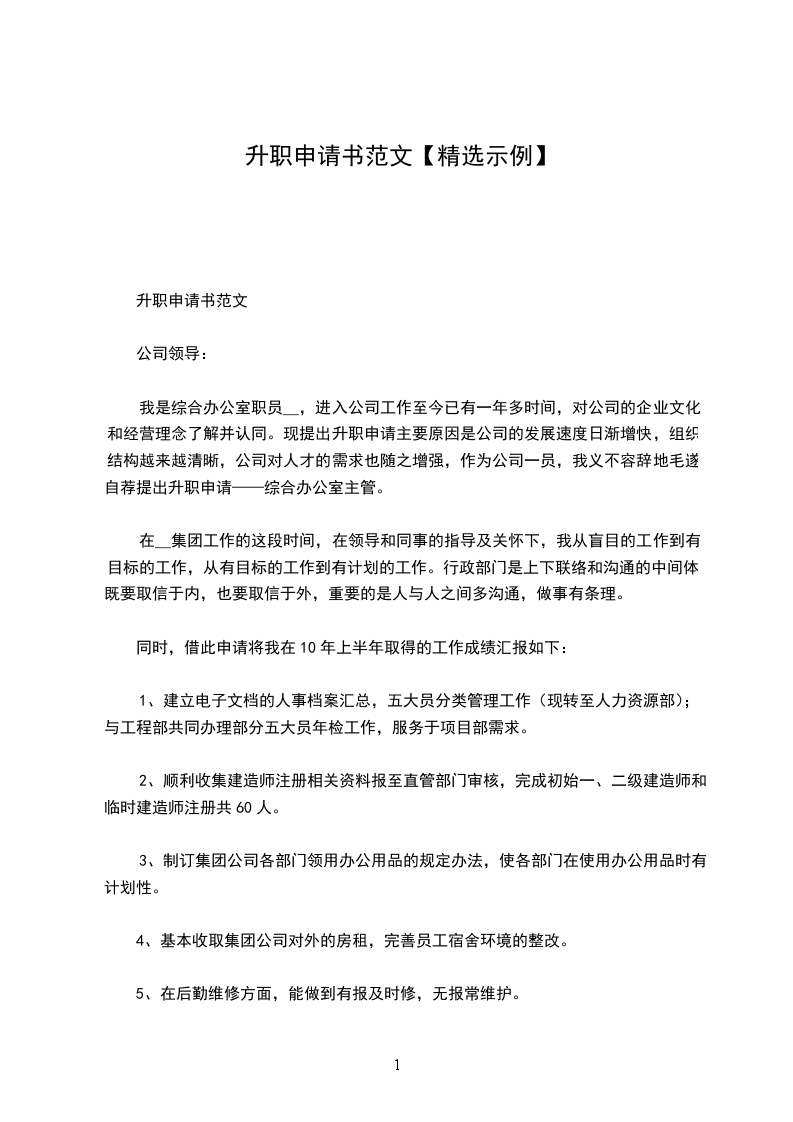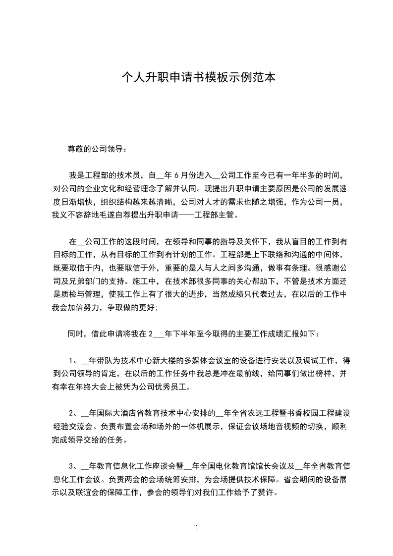 我是工程部的技术员,自__年6月份进入__公司工作至今已有一年半多的时间,对公司的企业文化和经营理念了解并认同。现提出升职申请主要原因是公司的发展速度日渐增快,组织结构越来越清晰,公司对人才的需求也随之增强,作为公司一员,我义不容辞地毛遂自荐提出升职申请——工程部主管。