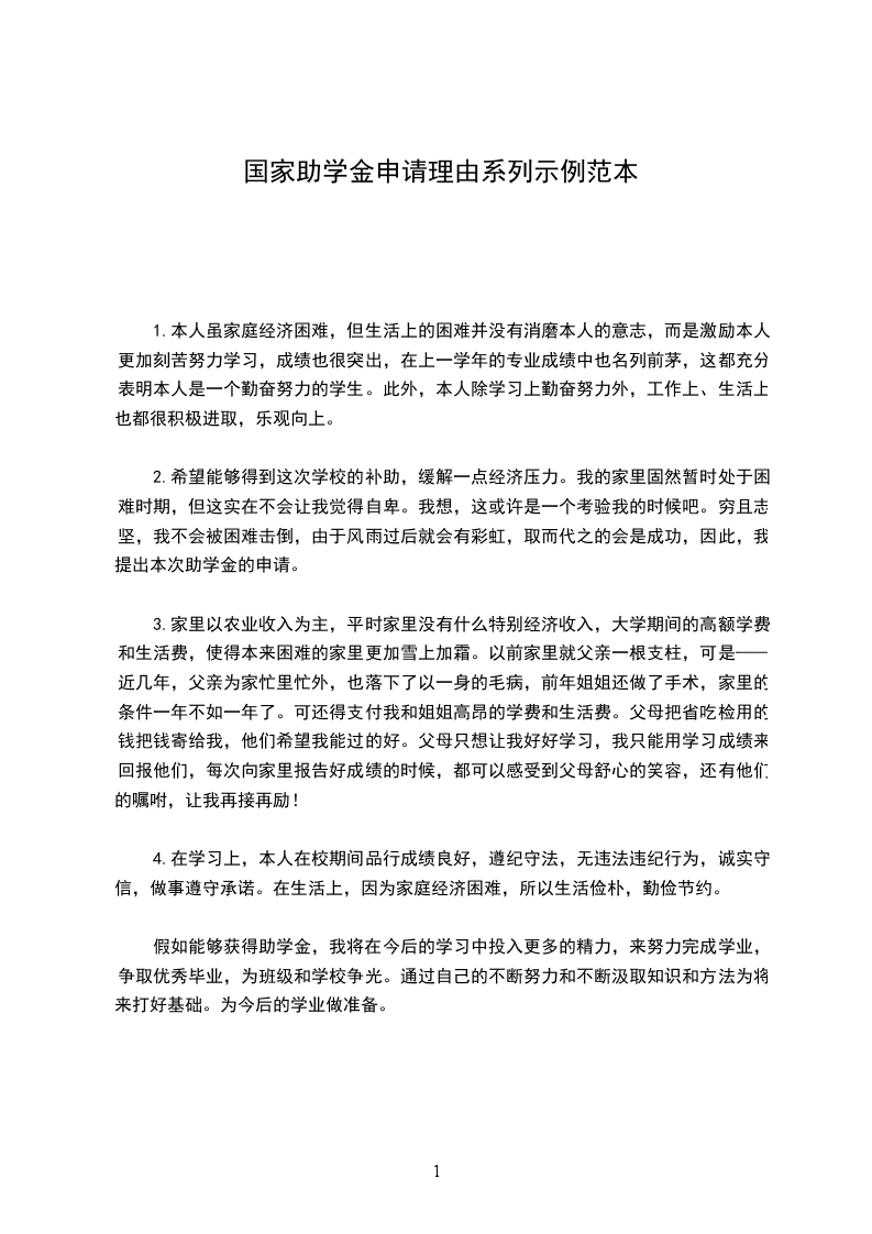 正是基于以上事实,为了能够保证我圆满的完成学业,为了将来能够更好的孝顺父母,回报社会,我郑重的向学校递交申请——申请国家助学金!希望学校领导批准!