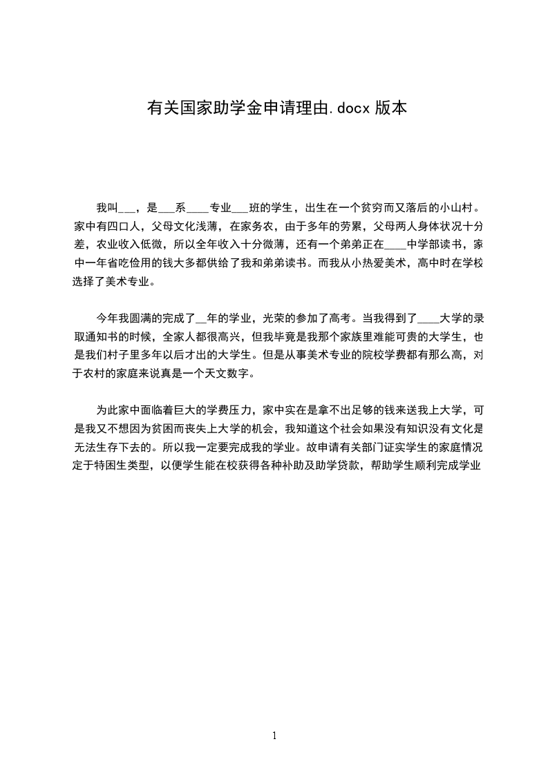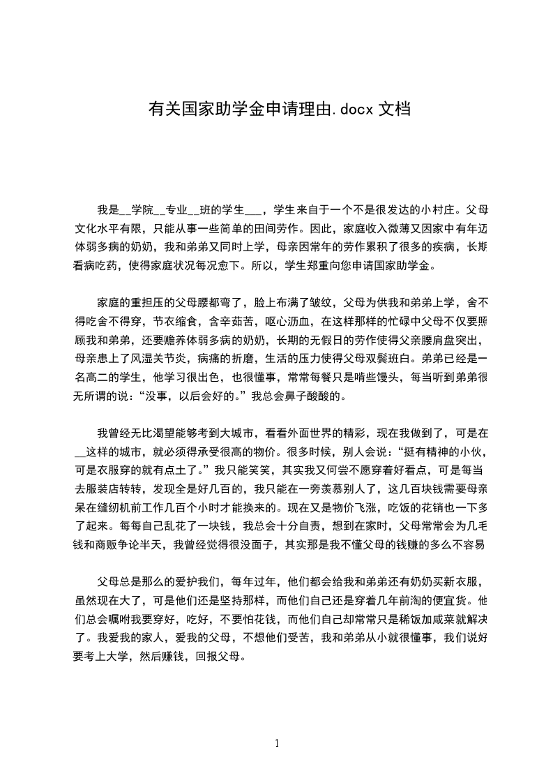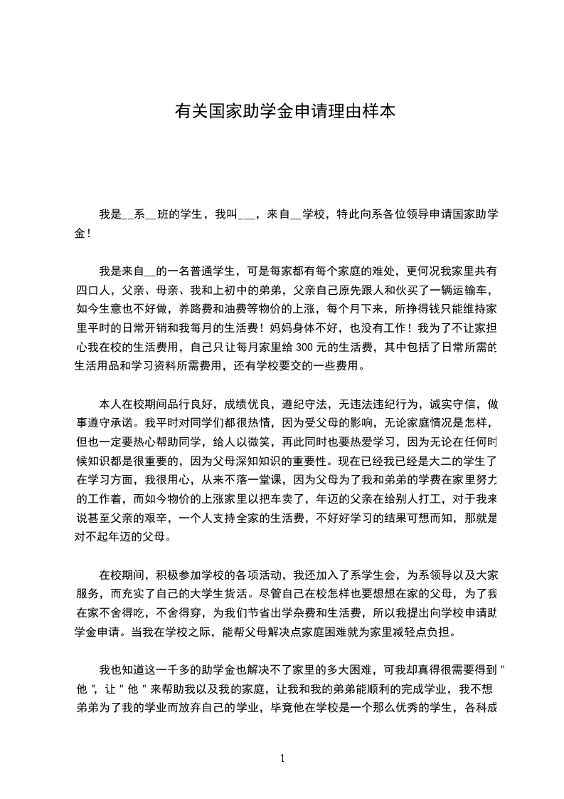 我是__学院__专业__班的学生___,学生来自于一个不是很发达的小村庄。父母文化水平有限,只能从事一些简单的田间劳作。因此,家庭收入微薄又因家中有年迈体弱多病的奶奶,我和弟弟又同时上学,母亲因常年的劳作累积了很多的疾病,长期看病吃药,使得家庭状况每况愈下。所以,学生郑重向您申请国家助学金。