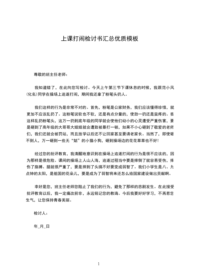 经过您的批评教育,我清醒地意识到在操场上追逐打闹的行为是很不应该的,因为那样是很危险。课间的操场上人山人海,追逐过程当中要是摔倒了就容易受伤,摔伤了胳膊、腿就很严重了,要是摔到了头搞不好要变成弱智了。我们小学生是八、九点钟的太阳,是祖国的花朵儿,要是成为了弱智将来还怎么给国家建设做出贡献啊。