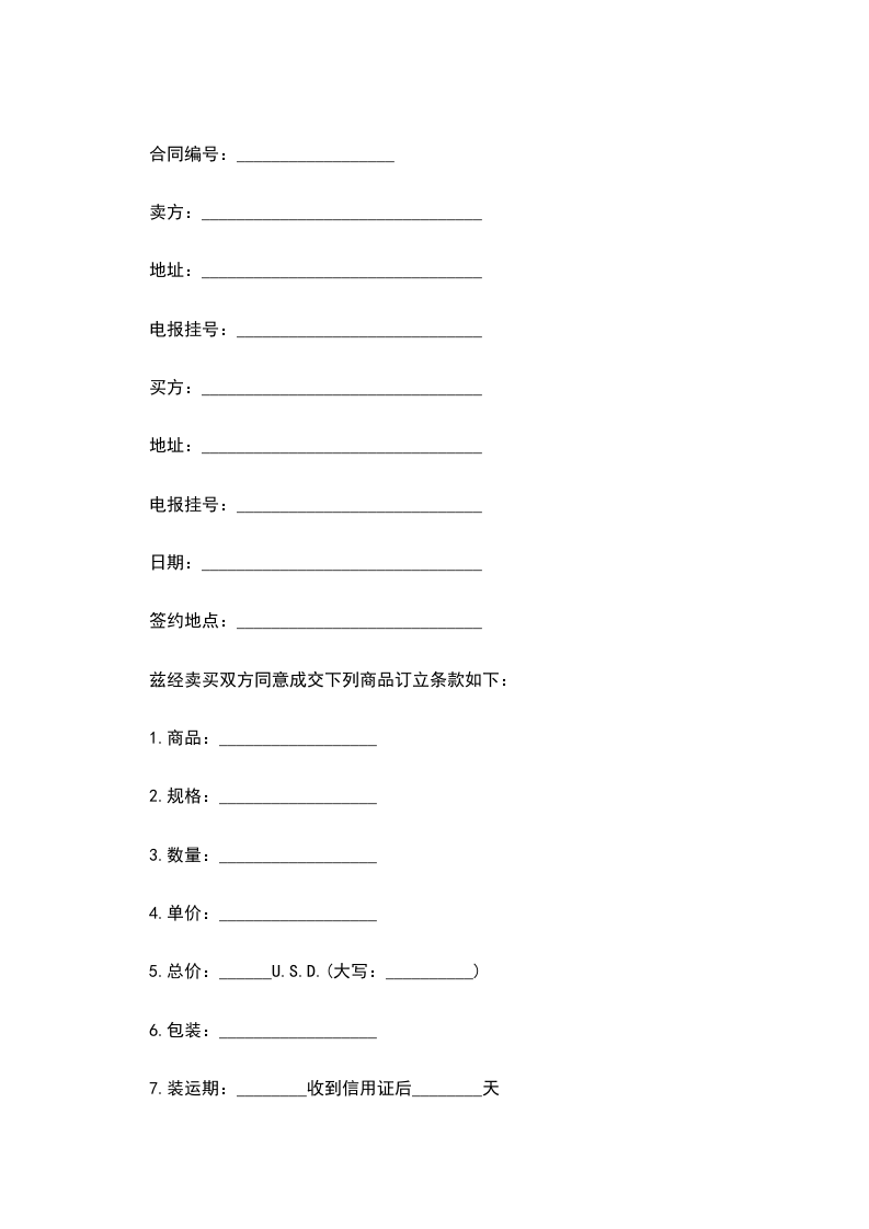 (1)买方须于____年____月____日前将保兑的、不可撤销的、可转让、可分割的即期信用证开到卖方。信用证议付有效期延至上列装运期后,____天在____到期。