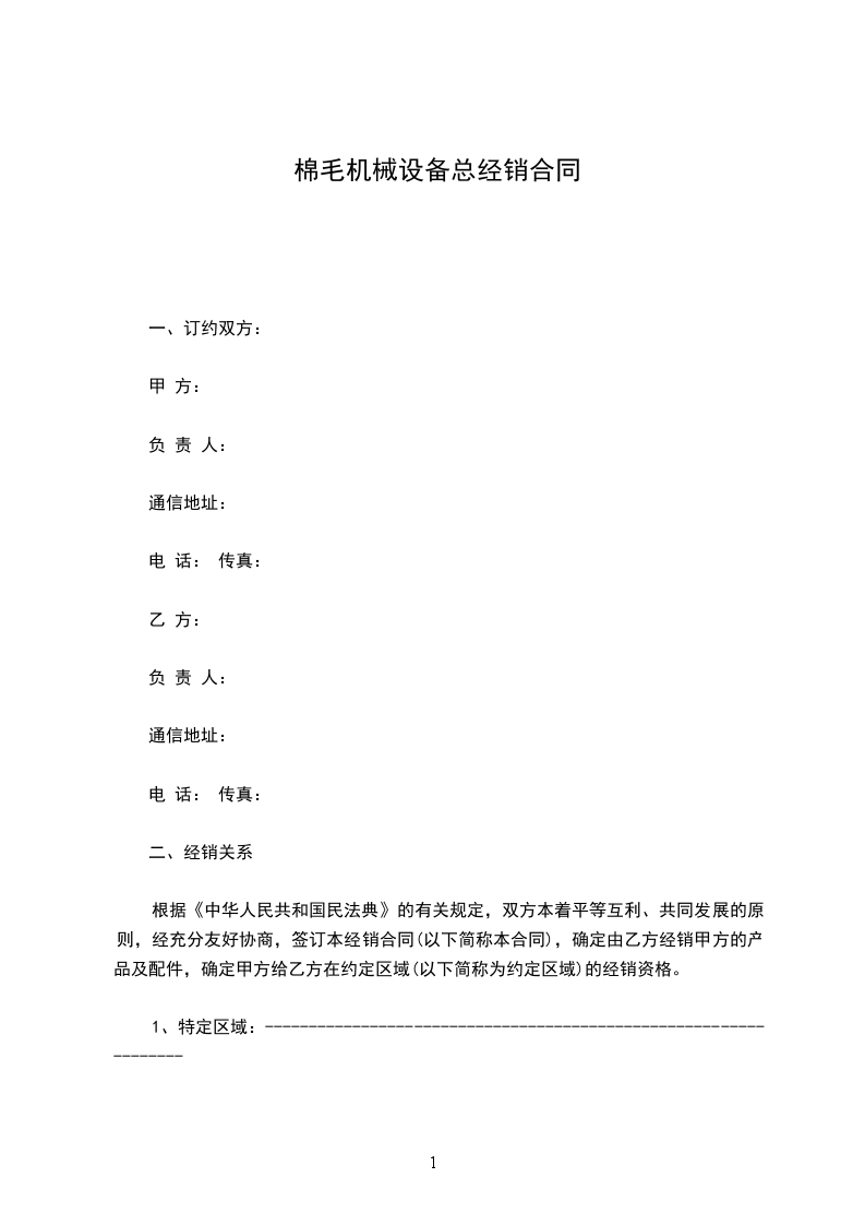 根据《中华人民共和国民法典》的有关规定,双方本着平等互利、共同发展的原则,经充分友好协商,签订本经销合同(以下简称本合同),确定由乙方经销甲方的产品及配件,确定甲方给乙方在约定区域(以下简称为约定区域)的经销资格。